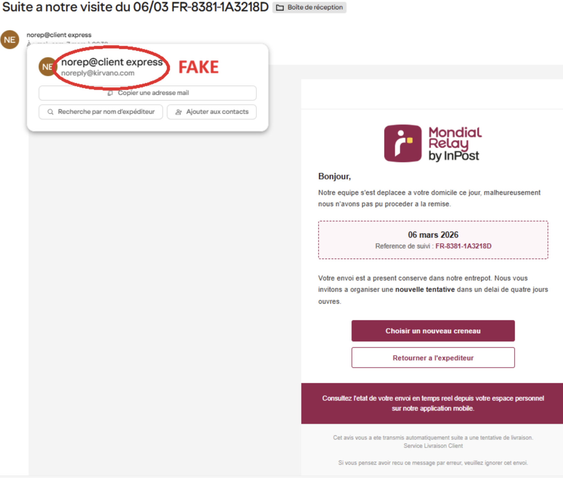 Ces derniers jours, de nombreux mails, semblant provenir du service de livraison Mondial Relay, circulent. Ces mails indiquent que vous n’étiez pas chez vous pour la réception du colis, et vous invitent à cliquer sur un lien pour planifier une nouvelle livraison dans un délais très court.