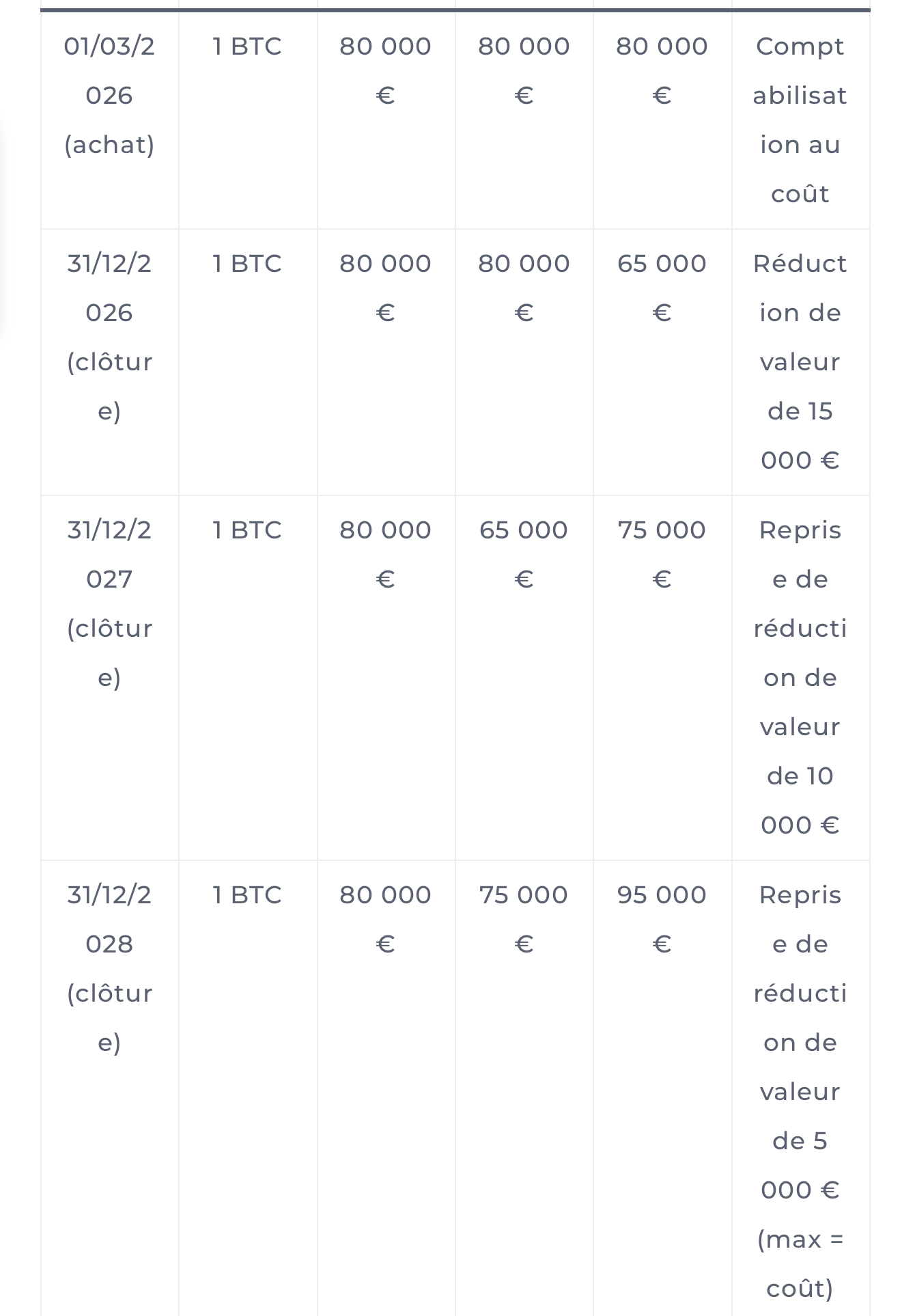 À chaque date de clôture (généralement le 31 décembre), la société doit comparer la valeur comptable de ses crypto-actifs à leur valeur de marché.