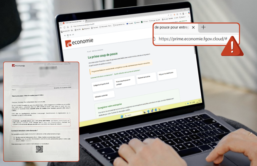 La lettre promet une prime pouvant aller jusqu’à 5.000 euros. Seules les 5.000 premières entreprises à réagir seraient éligibles. Le sentiment d’urgence est donc habilement exploité afin de pousser les entreprises à décider rapidement. Les entrepreneurs reçoivent même un code unique leur permettant de se connecter au site internet https://prime.economie.fgov.cloud/, accessible également via un code QR figurant sur la lettre.