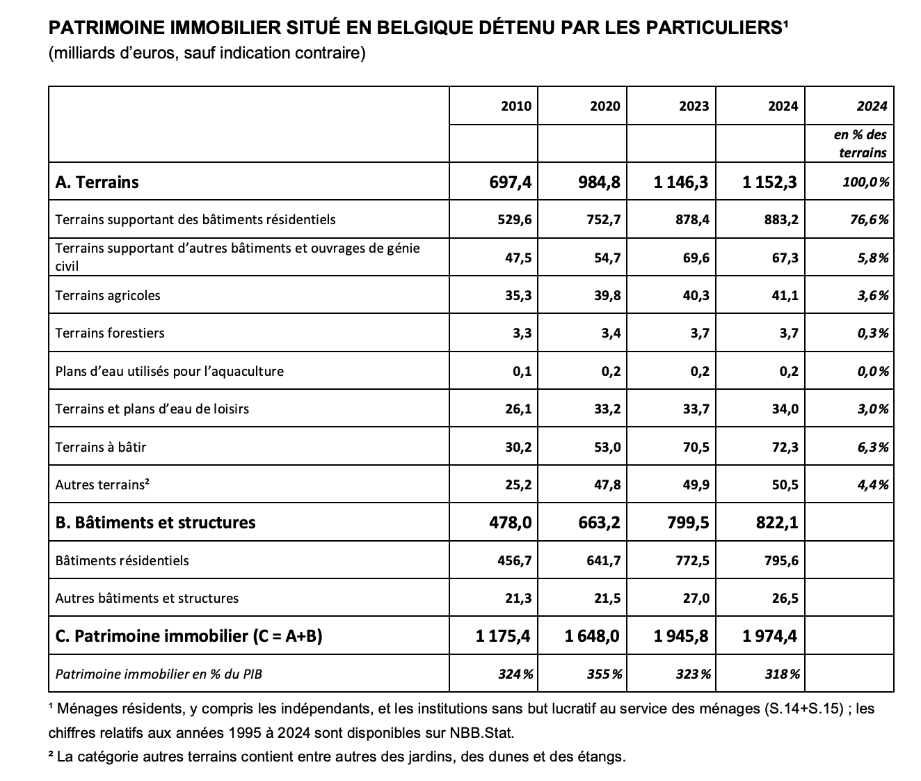 Seuls les terrains situés en Belgique entrent en ligne de compte. Les terrains supportant des bâtiments résidentiels en représentent la grande majorité (76,6 % en 2024). Les autres principales catégories de terrains en possession des particuliers sont des terrains à bâtir (6,3 %), des terrains supportant d’autres bâtiments et