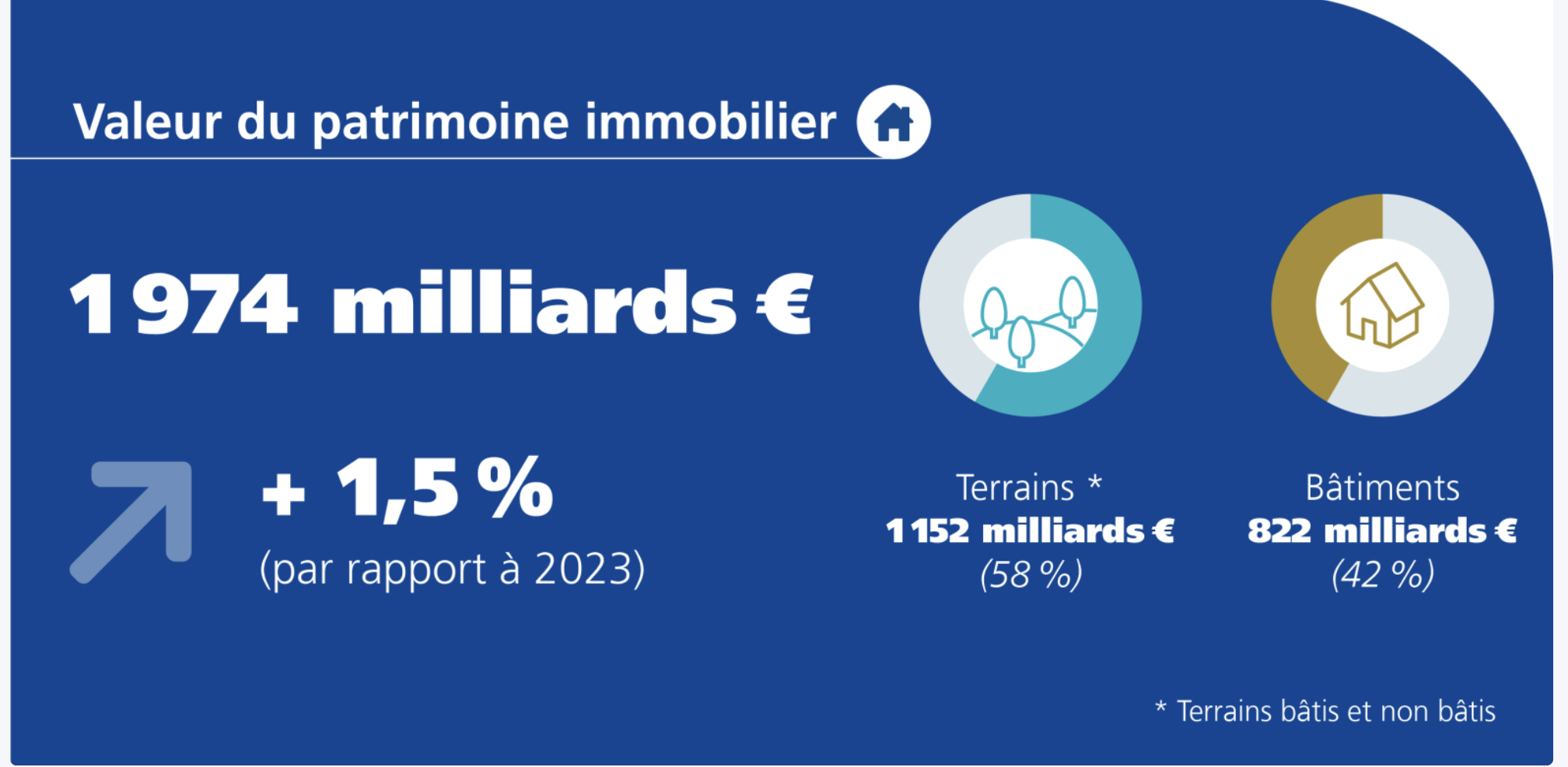 Le stock immobilier des particuliers sous la forme de bâtiments est quant à lui évalué à 822 milliards d’euros en 2024, ce qui correspond à une augmentation de 2,8 % par rapport à 2023. Les bâtiments résidentiels constituent la grande majorité de ce stock (97 %).