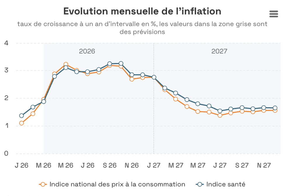 En moyenne 2.6% en 2026 et 1,7% en 2027, contre 2,47% en 2025 et 3,14% en 2024. Cause : Les prévisions d'inflation les plus récentes ont été établies pour la période allant de mars 2026 à décembre 2027. Les observations jusqu'en février 2026 sont disponibles auprès de Stabel.