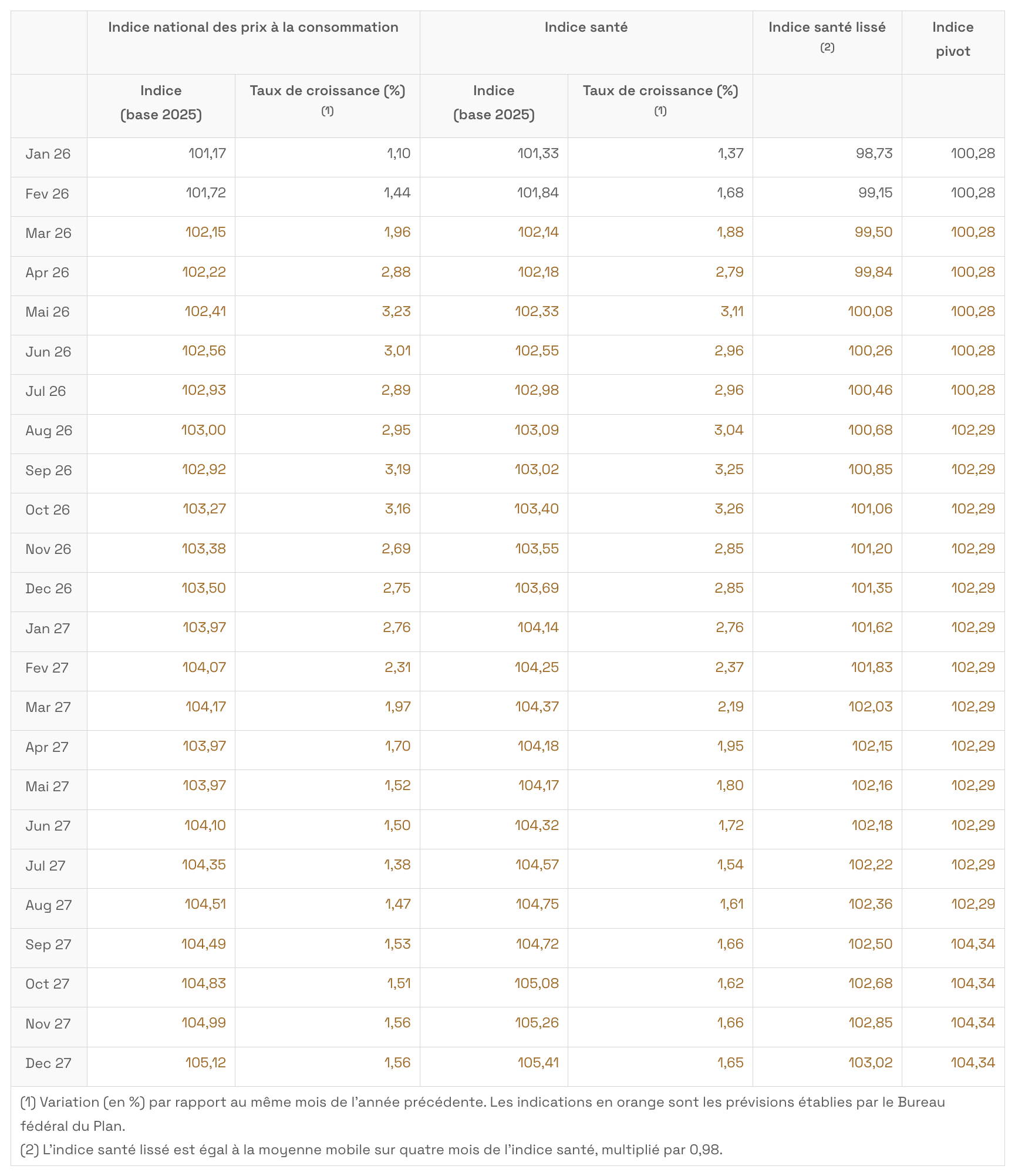 L'indice pivot suivant (102,29, année de base 2025) serait dépassé en août 2027.