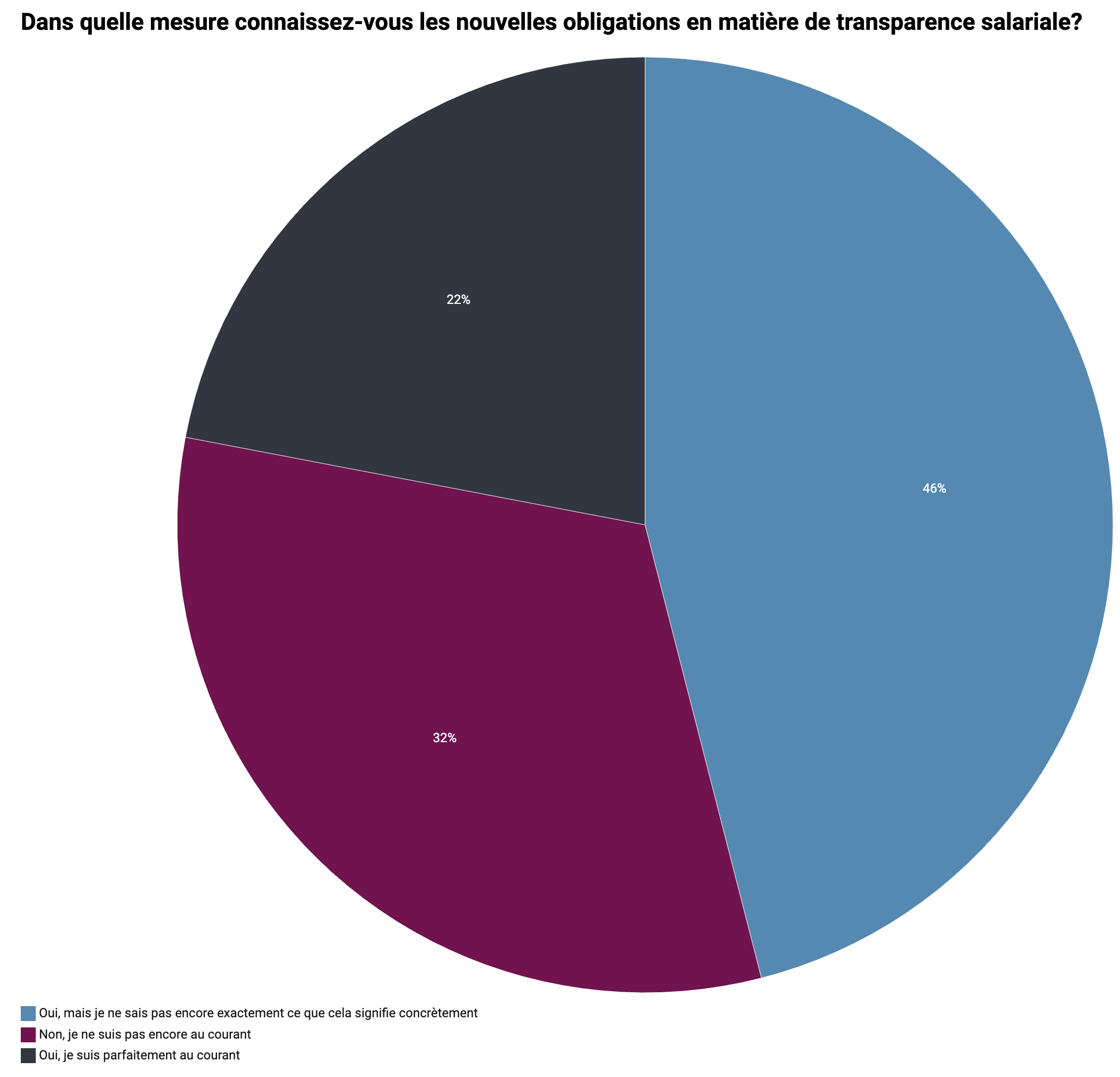 Seule une PME sur cinq est pleinement informée des futures obligations en matière de transparence salariale. Près de la moitié (46 %) en a entendu parler, mais ne sait pas exactement ce que cela implique. Environ une sur trois (32 %) n’est pas du tout au courant. En résumé : près de huit PME sur dix (78 %) déclarent ne pas savoir précisément de quoi il s’agit.