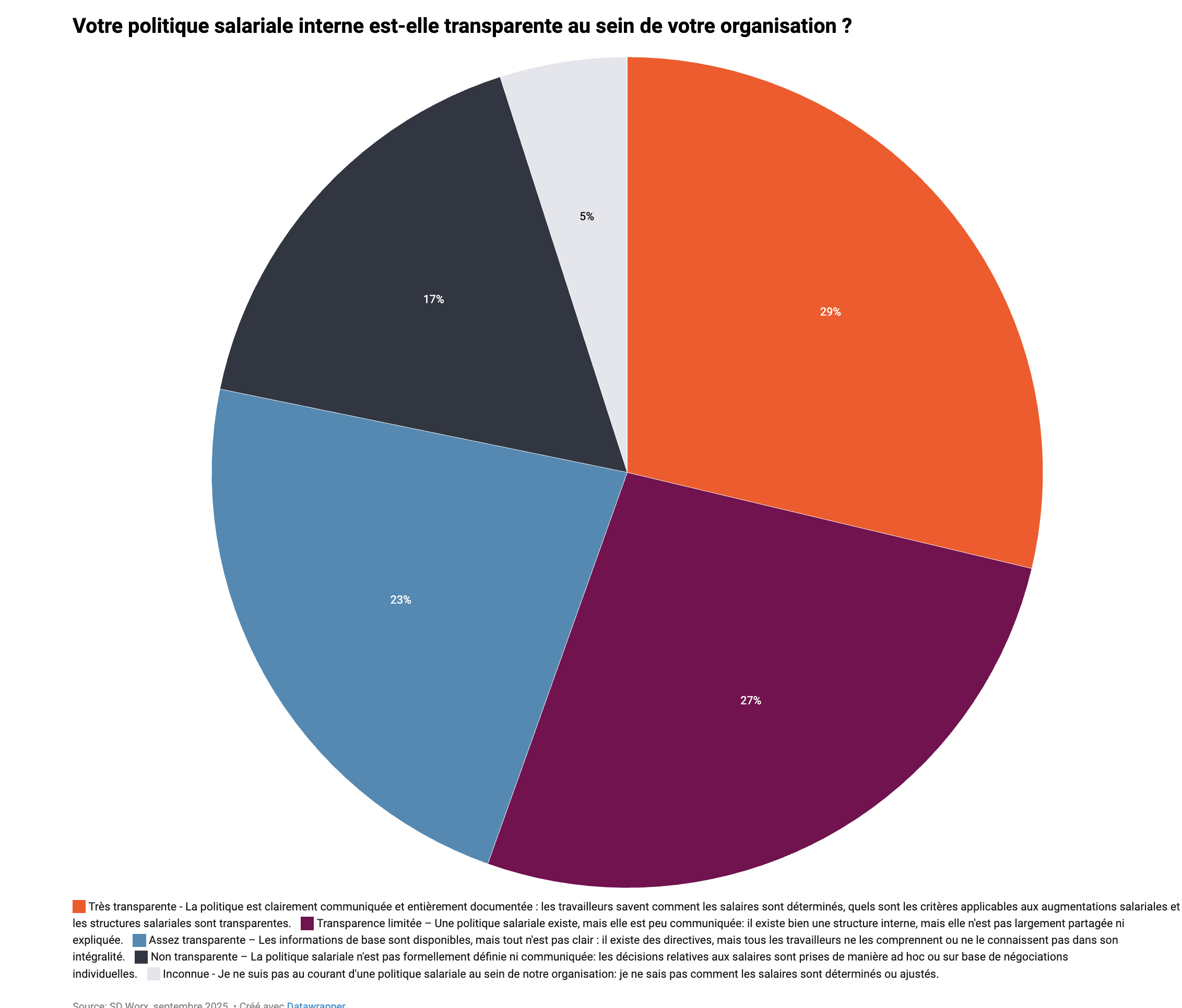 De plus, 27 % des PME reconnaissent n’être que partiellement transparentes : une structure salariale existe, mais elle est peu communiquée. La politique existe, mais n’est pas largement partagée ou expliquée en interne.