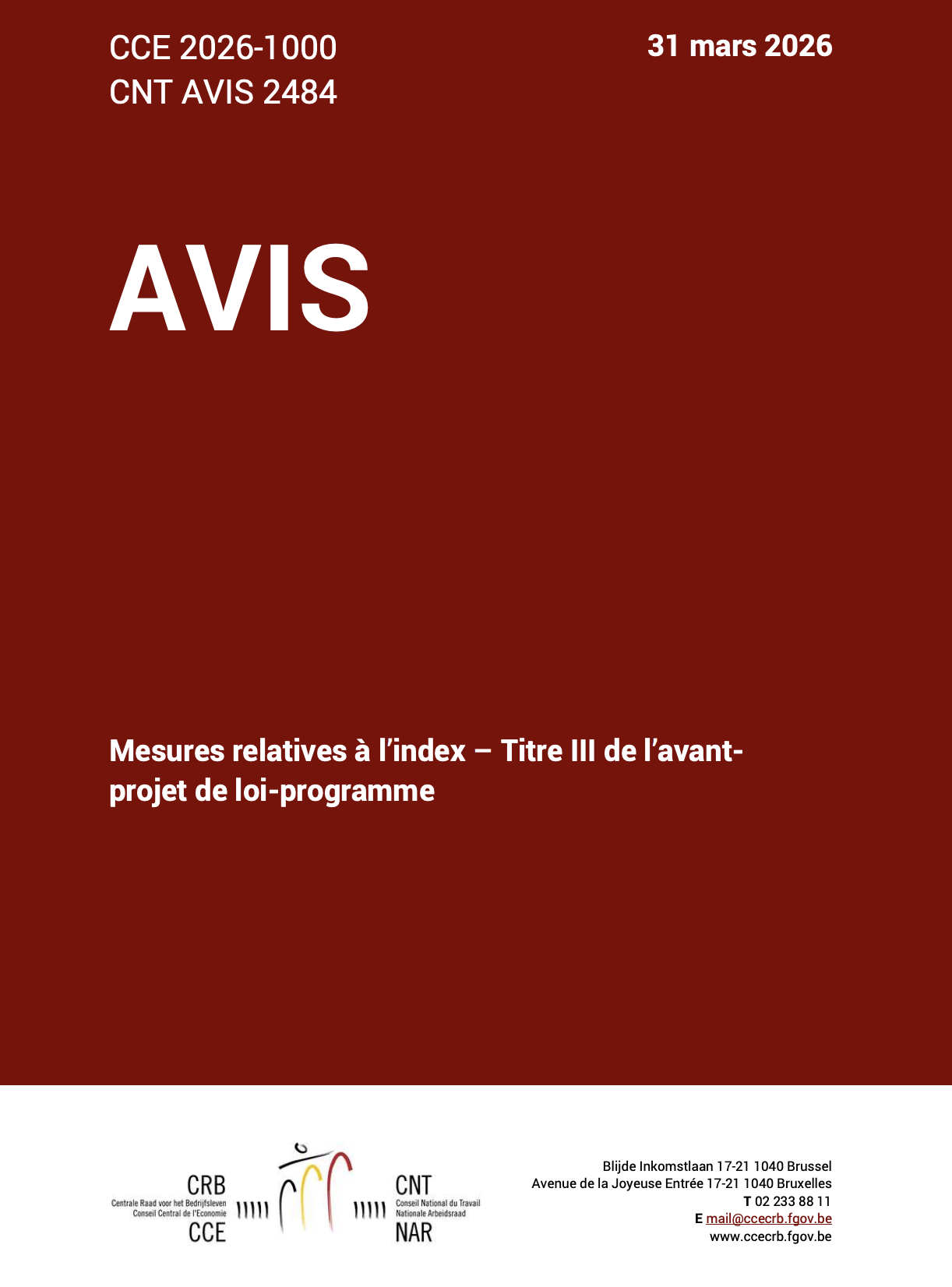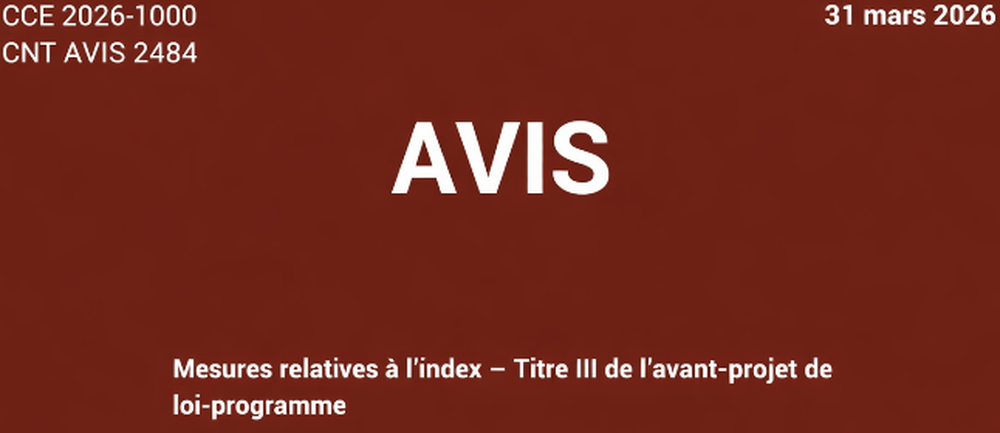 Réunis en séance conjointe le 31 mars 2026, le Conseil national du travail (CNT) et le Conseil central de l’économie (CCE) ont rendu un avis sur les mesures d’indexation prévues dans le projet de loi-programme, qui doit être soumis au vote en séance plénière à la Chambre ce 1er avril : plafonner l'indexation sur les allocations de plus de 4.000 euros et les salaires excédant 4.000 euros brut.