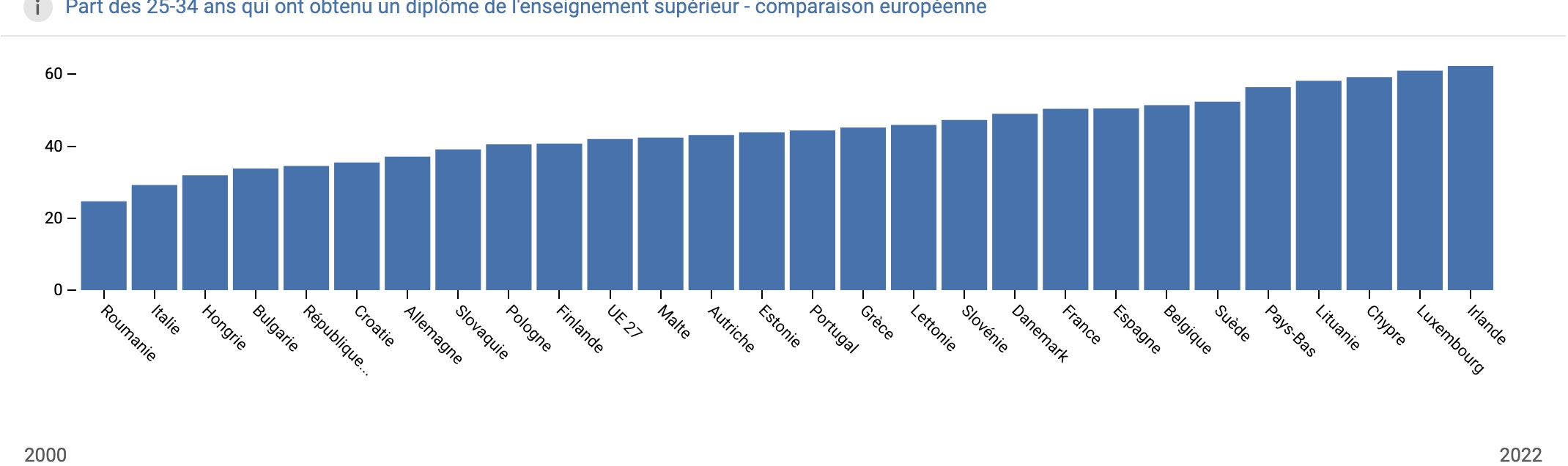 Cependant, ce résultat semble être principalement dû au niveau d’instruction élevé des femmes, pour lesquelles l’objectif de 45% de 25-34 ans diplômées de l’enseignement supérieur avait déjà été atteint en 2004. En 2023, pas moins de 57,3% des femmes de 25 à 34 ans avaient un diplôme de l’enseignement supérieur.