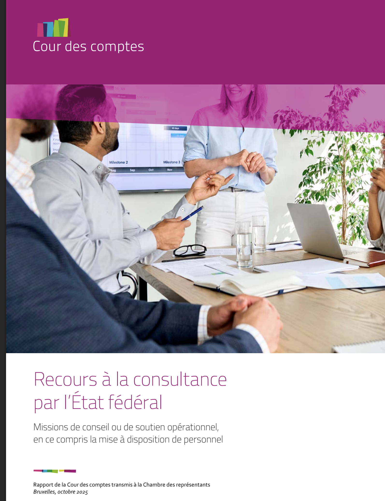 Le rapport « Recours à la consultance par l’État fédéral - Missions de conseil ou de soutien opérationnel, en ce compris la mise à disposition de personnel » a été transmis au Parlement ce 12 novembre 2025 Ce rapport, la synthèse et ce communiqué de presse sont disponibles sur www.courdescomptes.be.