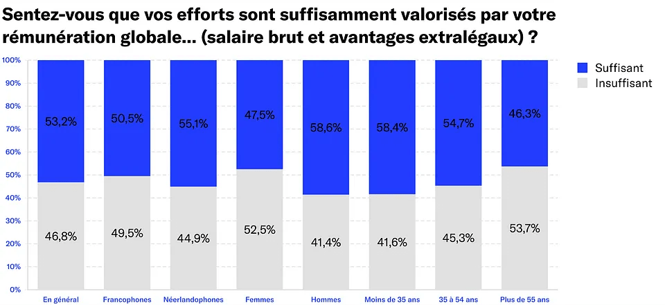 Le mois de janvier est souvent considéré comme une période charnière pour les employés. Environ 53,2 % des travailleurs belges estiment être suffisamment valorisés à l'heure actuelle par leur rémunération (salaire brut et avantages extralégaux). C'est ce qui ressort d'une enquête menée par Partena Professional auprès de 2 000 travailleurs et 250 employeurs. Les francophones, les femmes et les employés de plus de 55 ans sont plus susceptibles de déclarer que leurs efforts ne sont pas suffisamment reconnus.