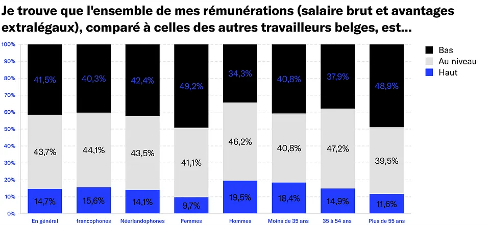 Partena Professional constate également que la plupart des Belges considèrent que leur rémunération est correcte. Environ 4 sur 10 (43,7 %) trouvent leur salaire « correct » par rapport à celui des autres travailleurs en Belgique, mais presque autant de Belges (41,5 %) trouvent son salaire plutôt bas par rapport à celui des autres. 14,7 %, soit un groupe non négligeable, trouvent son salaire élevé.