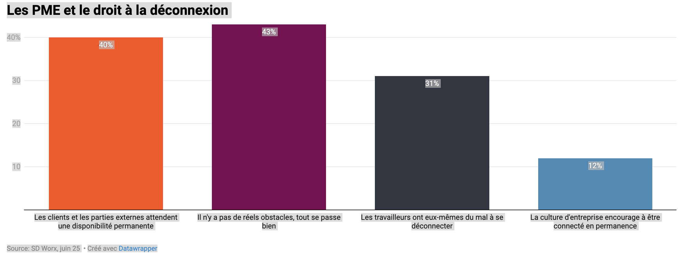 « Le droit à la déconnexion est difficile pour environ une PME sur dix aujourd'hui en raison d'une culture de la disponibilité permanente. Celles-ci peuvent s'inspirer de la combinaison de mesures que d'autres PME appliquent déjà », conclut SD Worx.
