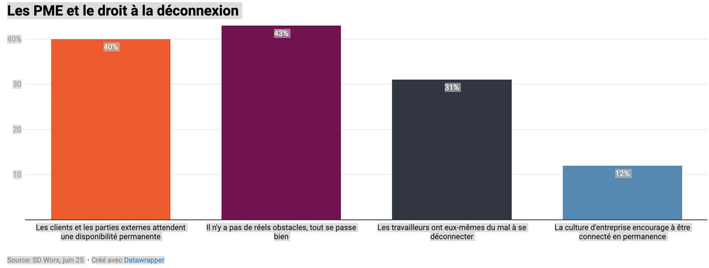 Toutefois, un ancrage formel reste rare. En effet, les PME sont confrontées aux attentes des clients (40 %) et à une culture de travail dans laquelle les collaborateurs peinent eux-mêmes à se déconnecter (31 %). Seules 10 % des PME adoptent une culture d'entreprise « always-on », dans laquelle la connectivité est permanente.