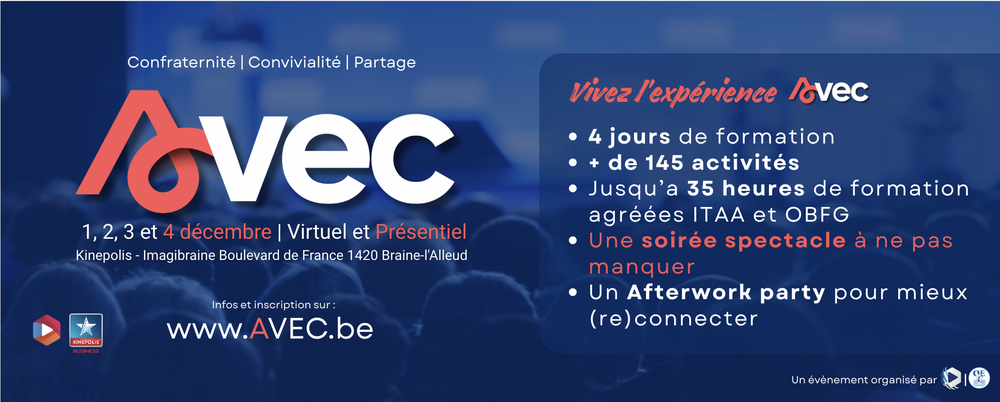 > 1, 2, 3 décembre – en virtuel via oFFFcourse > 4 décembre – en présentiel à ImagiBraine > 35h de formation agréée ITAA & OBFG > 145 activités, 100 orateurs, 1 soirée-spectacle et 1 AfterWork Party