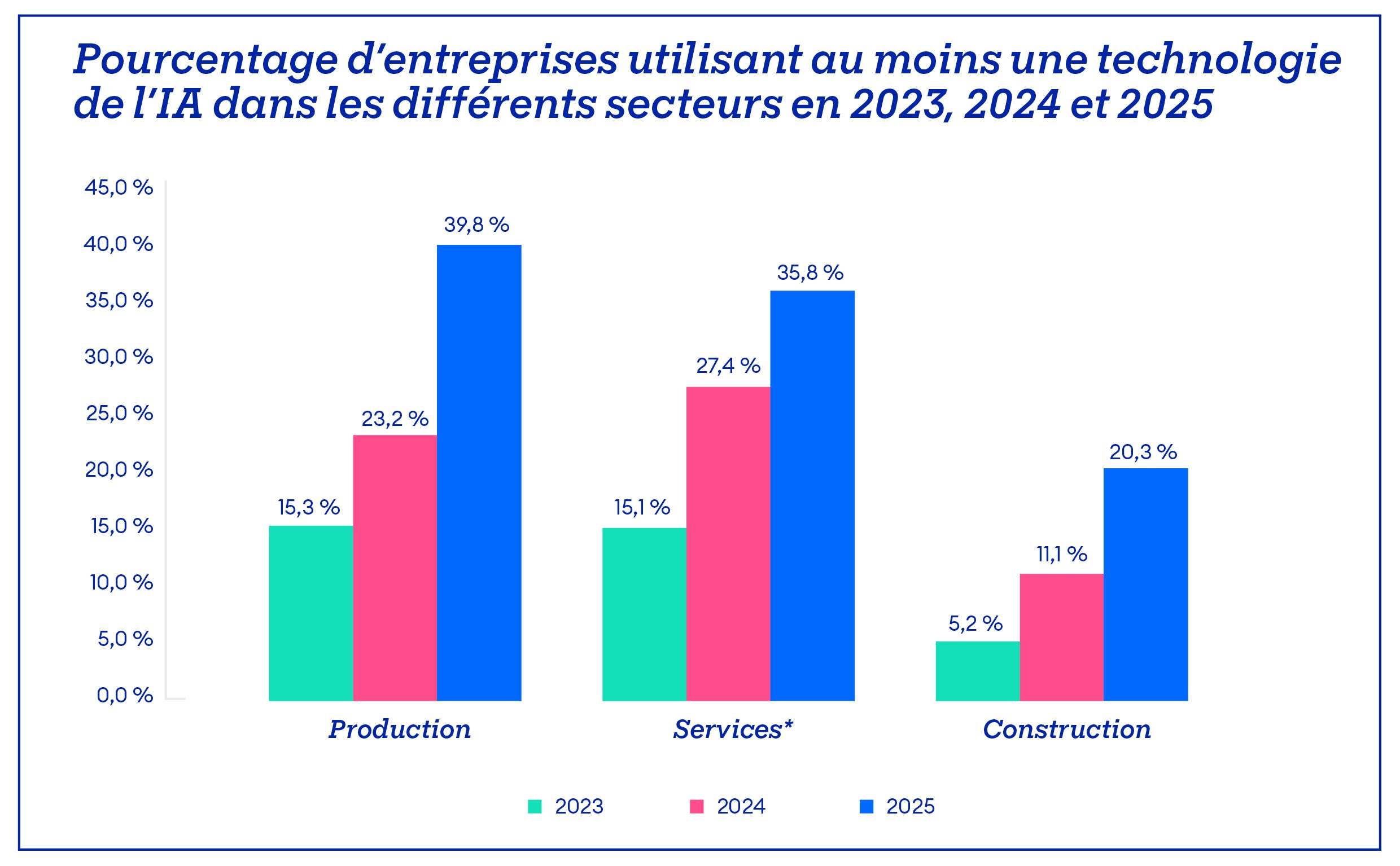 Alors que le secteur des services était encore en tête de l’adoption de l’IA l’année dernière, le secteur de la production a repris cette position l’année écoulée. Pas moins de 39,8 % des entreprises manufacturières utilisent l’IA, soit une hausse de 71,3 %. Le secteur de la construction est également en plein essor, avec une croissance de 82,8 %. Dans ces secteurs, l’IA gagne sans cesse du terrain, d’une part dans les différentes formes de communication et, d’autre part, dans les processus mêmes, comme l’analyse des risques, la maintenance et les opérations, le contrôle de la qualité et la planification et le suivi des projets.