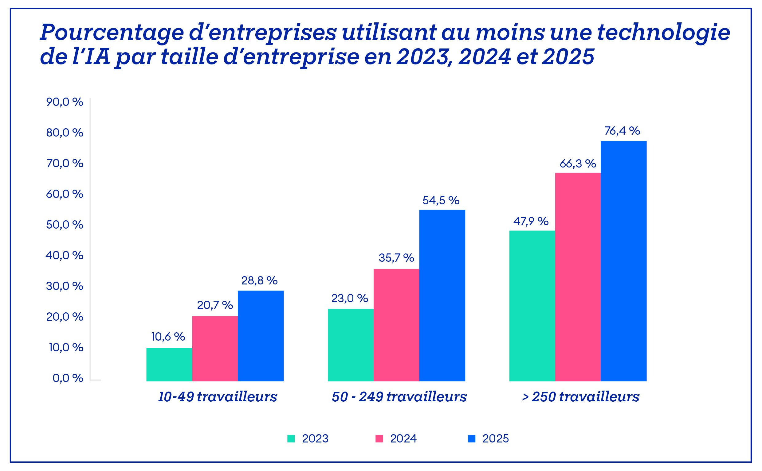 Illustration 3 : pourcentage d’entreprises utilisant au moins une technologie de l’IA par taille d’entreprise en 2023, 2024 et 2025, chiffres d’Eurostat