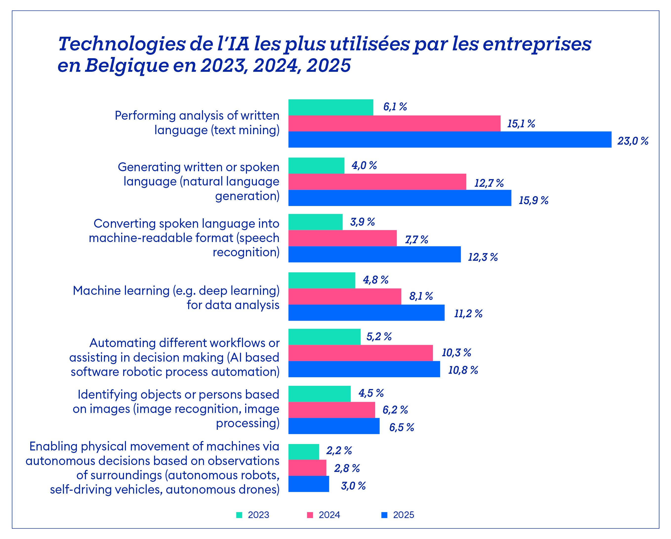 Illustration 4 : technologies de l’IA les plus utilisées par les entreprises en Belgique en 2023, 2024, 2025, Eurostat