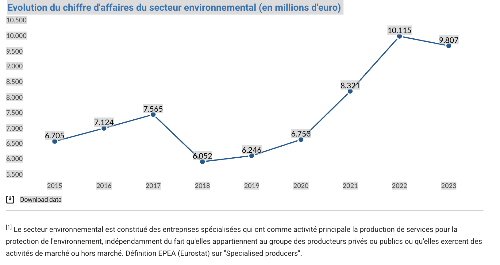 En 2023, le chiffre d'affaires des entreprises du secteur environnemental a atteint 9,8 milliards d'euros, enregistrant une baisse de 3,0% par rapport à l'année précédente tandis que la valeur ajoutée s’est élevée à 2,8 milliards d’euros (+2,0%).