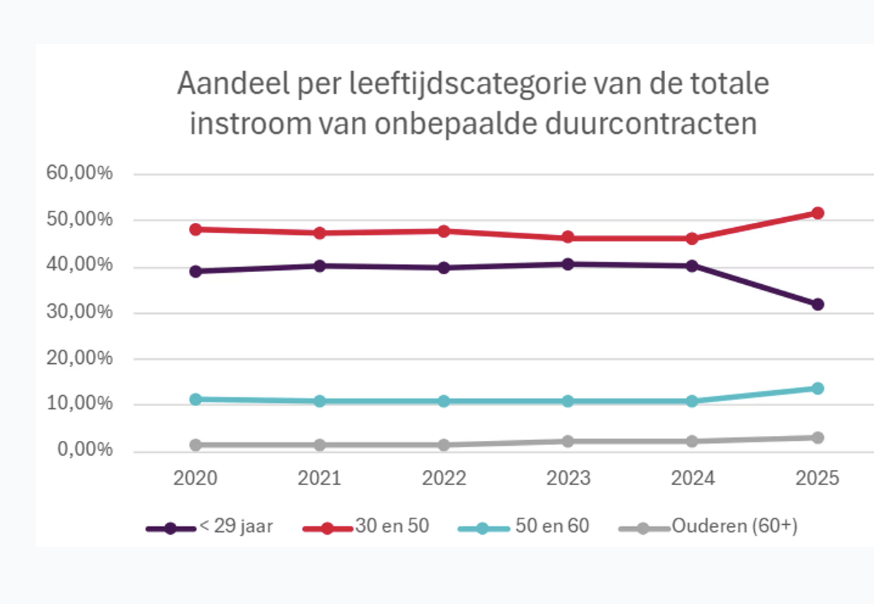 De terughoudendheid om jongeren een onbepaalde duurcontract aan te bieden is opvallend. Het aandeel van werknemers jonger dan 30 bij alle nieuwe contracten van onbepaalde duur kelderde van 40,3% in 2024 naar 31,8% in 2025, een relatieve daling van 21,3%. Die vrijgekomen ruimte wordt ingenomen door meer ervaren profielen. Het aandeel van de 30- tot 50-jarigen bij nieuwe aanwervingen van onbepaalde duur steeg in dezelfde periode van 46,3% naar 51,6%. Werkgevers lijken in de huidige context duidelijk de voorkeur te geven aan direct inzetbare, ervaren krachten.
