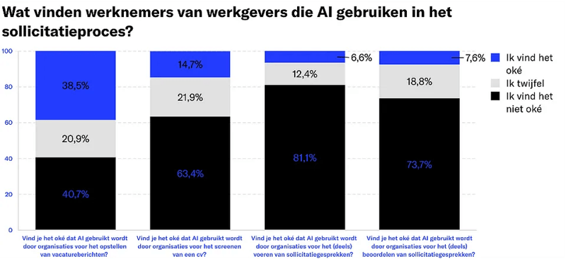 Meer dan zes op de tien werknemers (63,4%) vinden het niet oké dat werkgevers een cv laten screenen door AI. Slechts 14,7% vinden wel oké, de rest twijfelt. Wanneer het gaat om het laten beoordelen van sollicitatiegesprekken, zakt het aandeel dat dit oké vindt zelfs naar 7,6%.