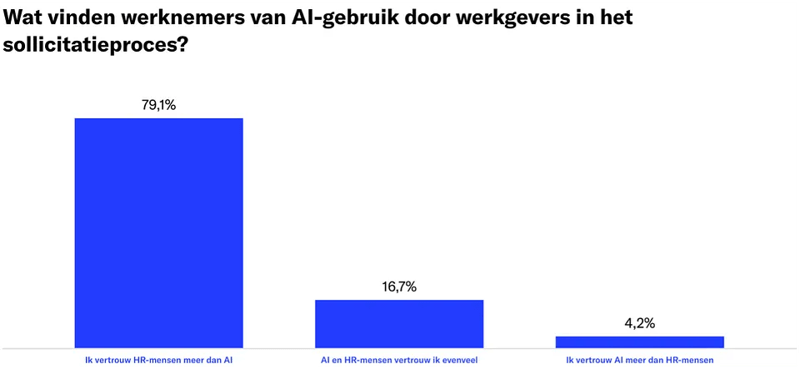 Daarnaast vertrouwt 79,1% van de werknemers HR-medewerkers meer dan AI. Slechts 4,2% zegt meer vertrouwen te hebben in artificiële intelligentie dan in een menselijke recruiter.