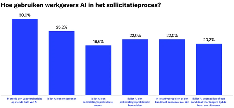 Uit nieuw onderzoek van Partena Professional in samenwerking met Stijn Baert bij 1.000 werknemers en 250 werkgevers blijkt dat vandaag een kwart van de werkgevers AI gebruikt om cv’s te screenen. Drie op de tien schrijven vacatures met behulp van artificiële intelligentie, maar het blijft niet bij tekstondersteuning.