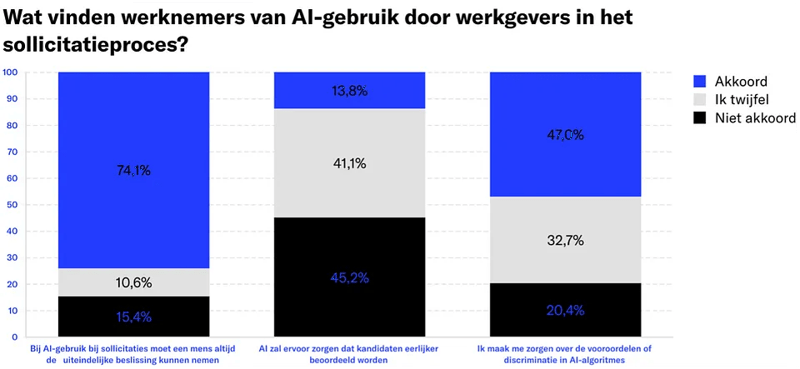 Ook het idee dat AI objectiever zou zijn, overtuigt niet. Bijna de helft van de werknemers gelooft niet dat AI kandidaten eerlijker zal beoordelen. 47,0% maakt zich zelfs zorgen over vooroordelen of discriminatie in AI-algoritmes, tegenover slechts 20,4% die dit niet doet (de rest twijfelt).