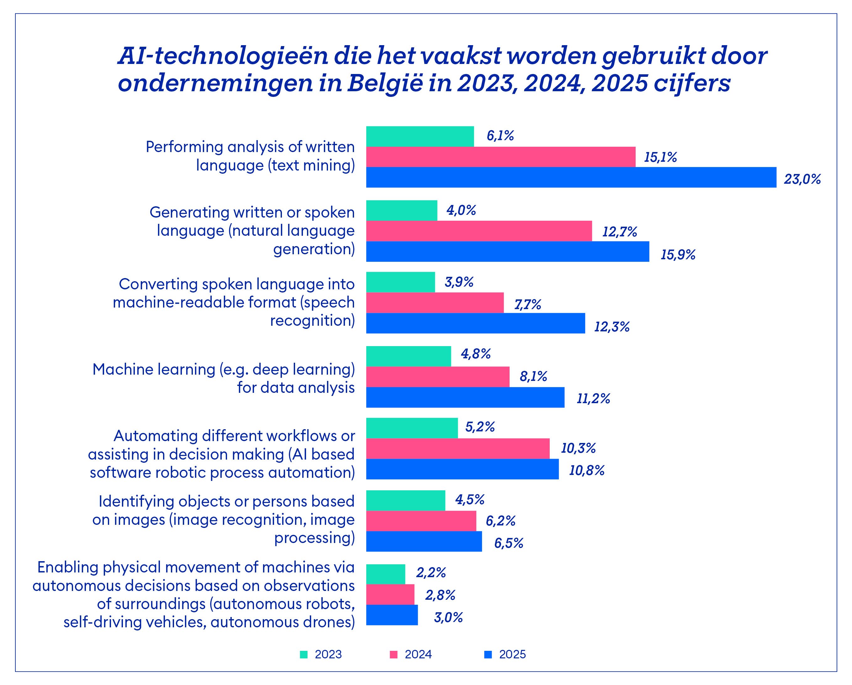Figuur 4: AI-technologieën die het vaakst worden gebruikt door ondernemingen in België in 2023, 2024, 2025 cijfers, Eurostat