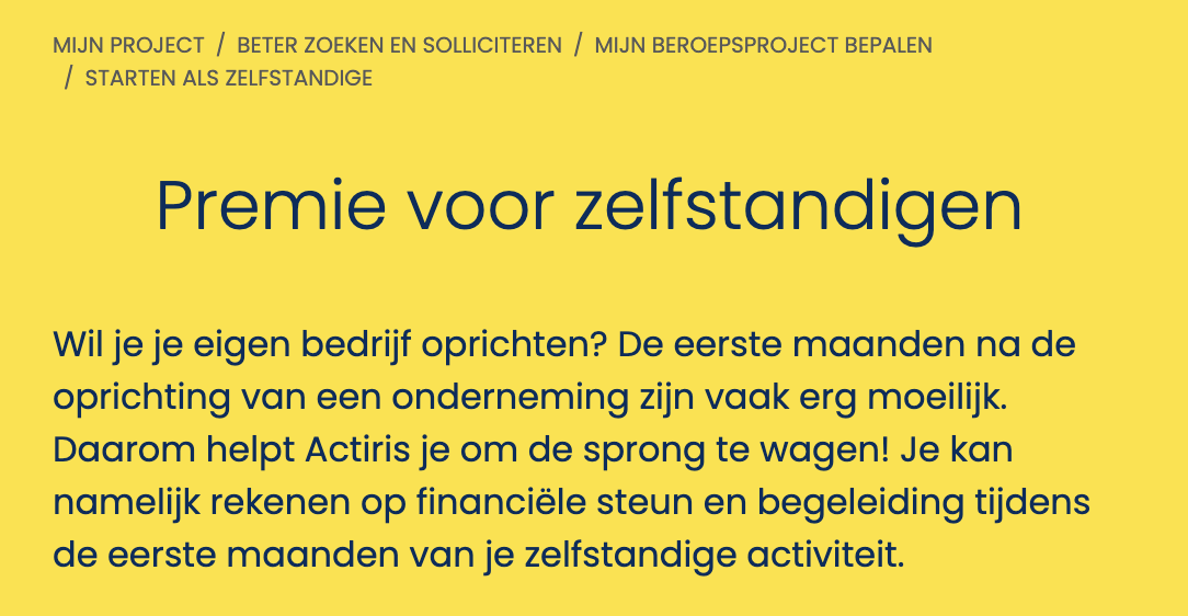 De premie voor zelfstandigen voorziet in financiële steun die kan oplopen tot 4.000 euro verspreid over zes maanden. Dit traject verloopt stapsgewijs: van de analyse van het project en de validatie van de levensvatbaarheid tot de activering van het statuut en de indiening van de aanvraag. Deze begeleiding wordt onder meer verzorgd door het Dreams Lab van Partena Professional, dat door Actiris erkend is als begeleidingsstructuur. Het doel is om administratieve fouten te vermijden en ondernemers te helpen hun activiteit correct op te starten. De ondersteuning zet zich vervolgens voort volgens een end-to-end logica, gericht op de duurzaamheid van de projecten.