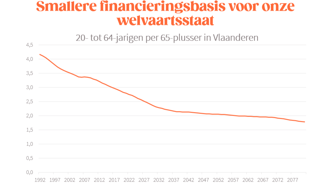 Ook in Vlaanderen blijft de veroudering van de bevolking uiteraard doorzetten. Van nu tot 2080 komen er 900.000 65-plussers bij (van 1,5 miljoen naar 2,4 miljoen). Midden jaren 90 waren er nog 4 mensen op actieve leeftijd per 65-plusser. Vandaag is dat teruggezakt tot 2,6, en tegen 2080 wordt dat 1,8. In een pensioenstelsel waarbij de huidige werkenden de huidige pensioenen betalen (er wordt dus geen kapitaal opgespaard voor het pensioen), zorgt die demografische dynamiek voor een zware druk op de financieringsbasis. Daarom neemt de federale regering nu eindelijk maatregelen om de financiële houdbaarheid van de pensioenen op langere termijn te vrijwaren (maar de huidige maatregelen zullen daarvoor nog niet volstaan).