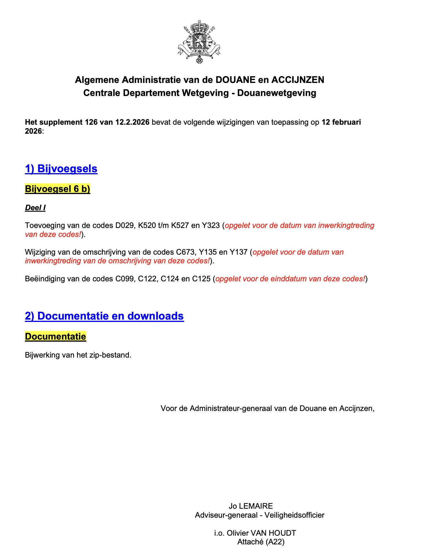 Op 12/O2/2026 verscheen het supplement 126 van het Enig Document dat verscheidene wijzigingen bundelt die van toepassing zijn vanaf 12 februari 2026.