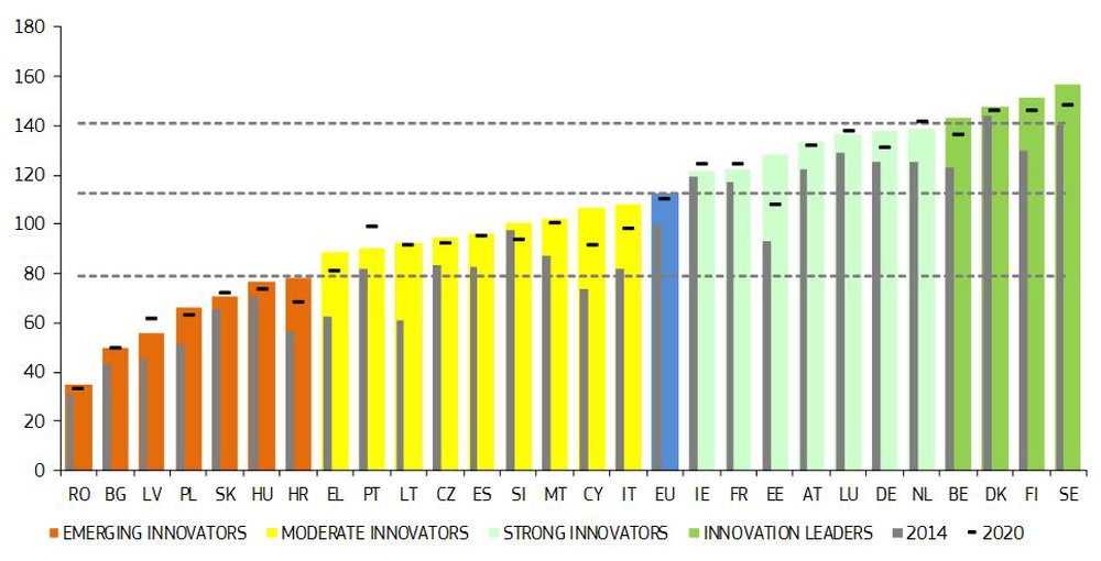 De EU-landen worden op basis van hun scores in vier prestatiegroepen ingedeeld: innovatieleiders, sterke innovatoren, matige innovatoren en opkomende innovatoren.