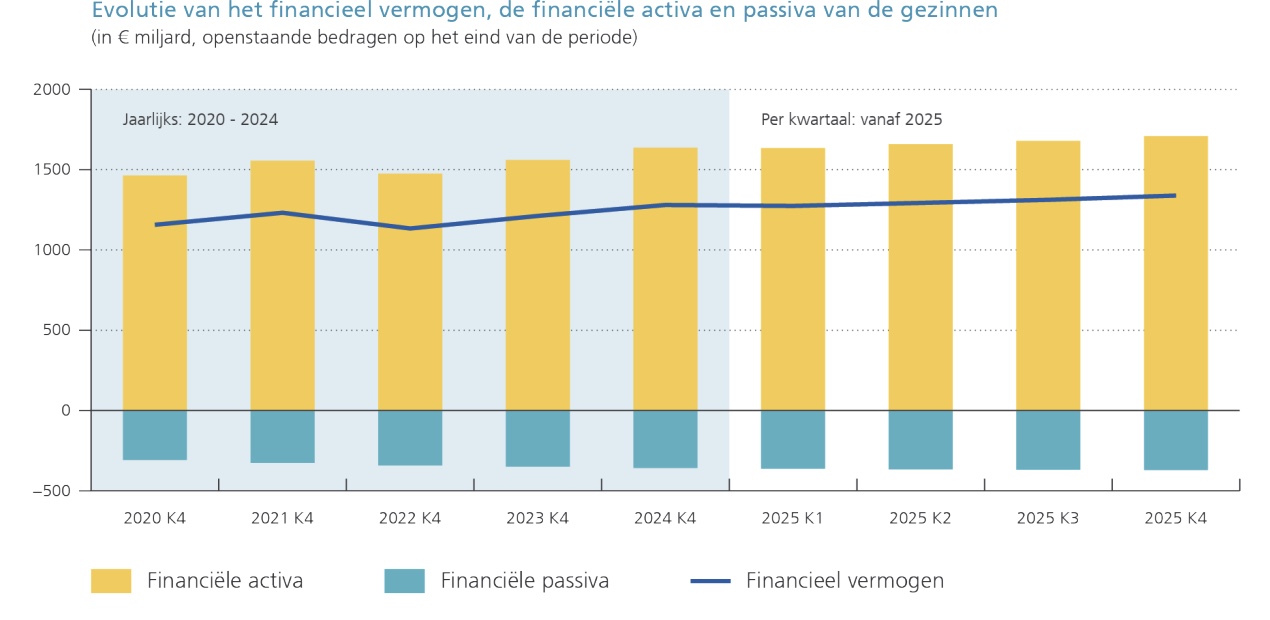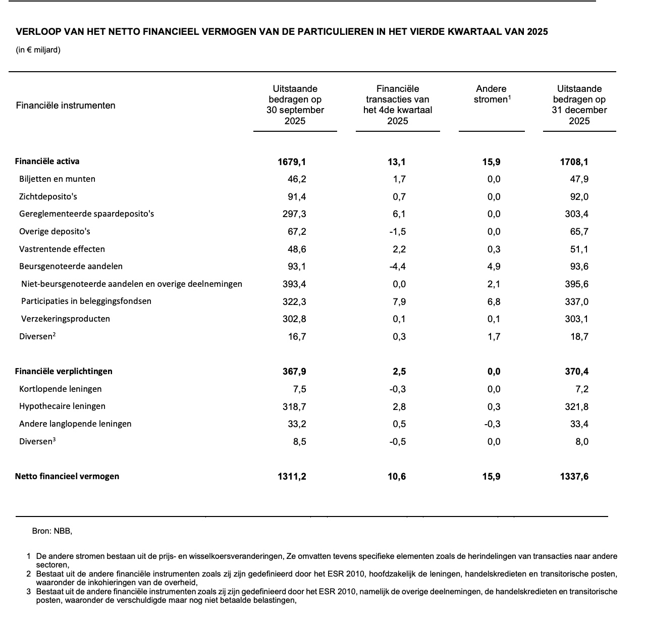 Het vierde kwartaal van 2025 droeg, met een stijging van 2%, flink bij aan de opmars van het financieel vermogen.Dat vermogen nam toe met € 26,5 miljard, waarvan € 10,6 miljard door netto transacties en € 15,9 miljard door waarderingseffecten.De financiële bezittingen van de Belgische gezinnen namen het laatste kwartaal van 2025 sterk toe met € 29miljard tot € 1708,1 miljard. Er werd € 13,1 miljard euro bijkomend geïnvesteerd en de waarde vermeerderingen op de portefeuille bedroegen € 15,9 miljard.De gezinnen stortten fors meer op spaarrekeningen (€ 6,1 miljard euro) en, in mindere mate, op zichtrekeningen(€ 0,7 miljard). Ook in beleggingsfondsen en schuldbewijzen werd extra geïnvesteerd, voor € 7,9 en € 2,2 miljardrespectievelijk. Termijnrekeningen en aandelen in beursgenoteerde bedrijven werden van de hand gedaan (€ -1,5en € -4,4 miljard respectievelijk). De verkopen van beursgenoteerde aandelen zijn mogelijks gedreven door de geplande invoering van de meerwaardebelasting vanaf 2026. Beleggers lijken daardoor meer diversificatie in hun portefeuille na te streven, onder meer via investeringen in beleggingsfondsen en schuldbewijzen.In het laatste kwartaal van een jaar verbetert traditiegetrouw de financiële positie van de gezinnen, onder andere dankzij de uitbetaling van de eindejaarspremie.