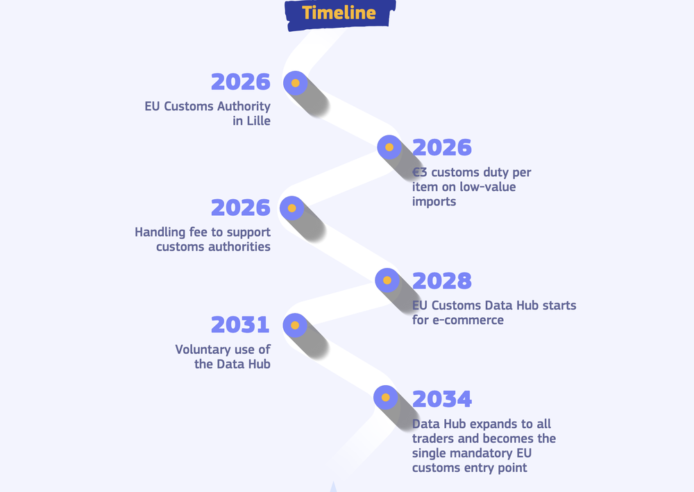 De EU-douaneautoriteit zal worden opgericht in nauwe samenwerking met de lidstaten, met enkele activiteiten vanaf 2027 en met de lancering van de EU-douanedatahub, het centrale gegevensplatform, voor e-handel in 2028. De datahub zal in 203 1 opengaan voor alle andere bedrijven, wat onmiddellijke voordelen, vereenvoudigingen en besparingen voor bedrijven zal opleveren. In 2034 zal de datahub worden uitgebreid tot alle handelaren en het enige verplichte EU-douanetoegangspunt worden.