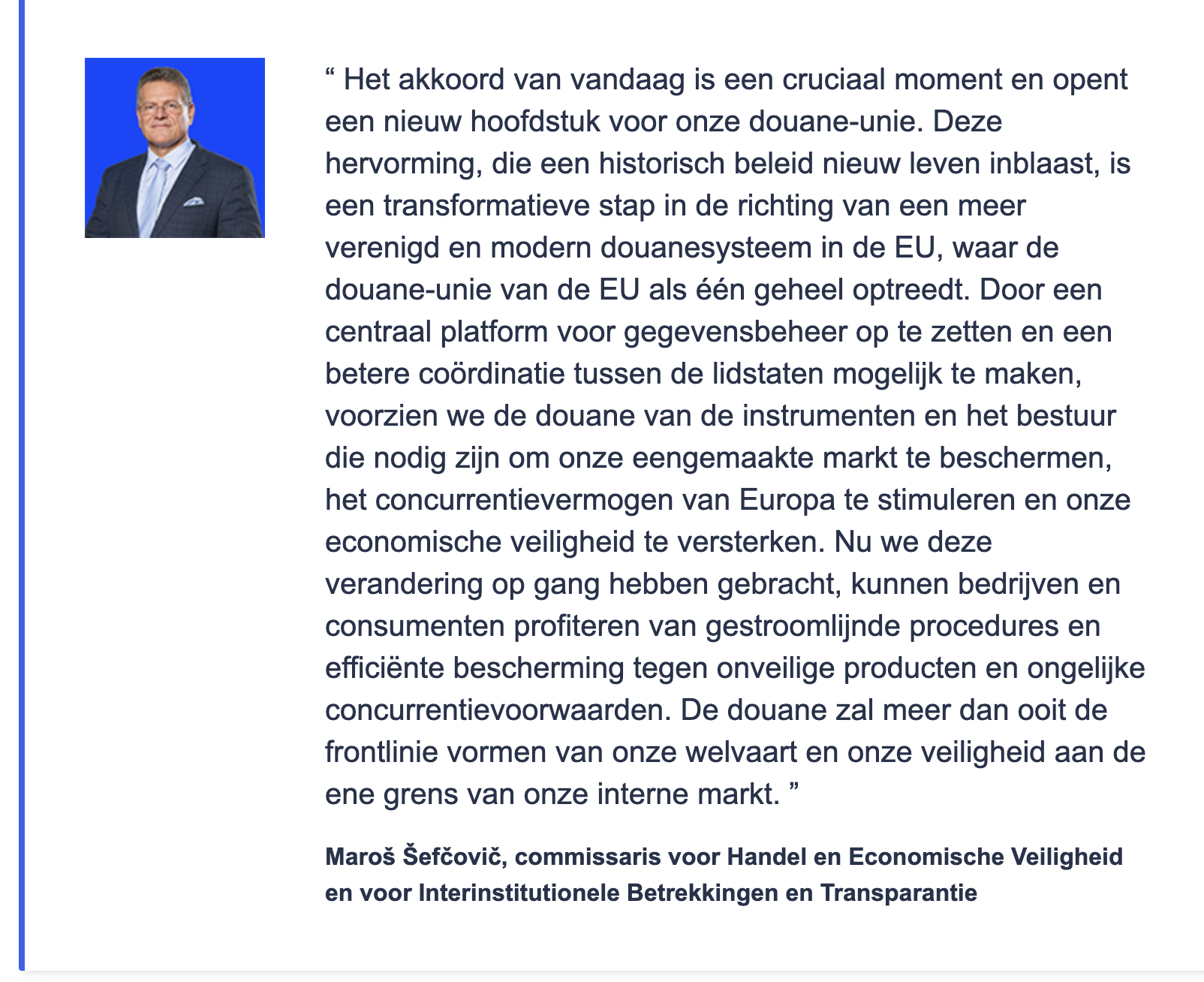 Het akkoord van vandaag is een belangrijke stap in de richting van een nieuwe, veerkrachtige en stabiele EU-douane-unie. De hervorming brengt nu een mix van onmiddellijke en langetermijnmaatregelen op gang.