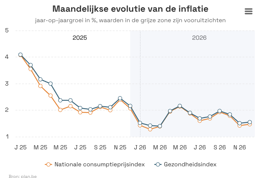 De toekomstige evolutie van de energieprijzen en de wisselkoersen is gebaseerd op termijnmarktnoteringen van 25 november 2025. Dat levert de volgende hypothesen op: