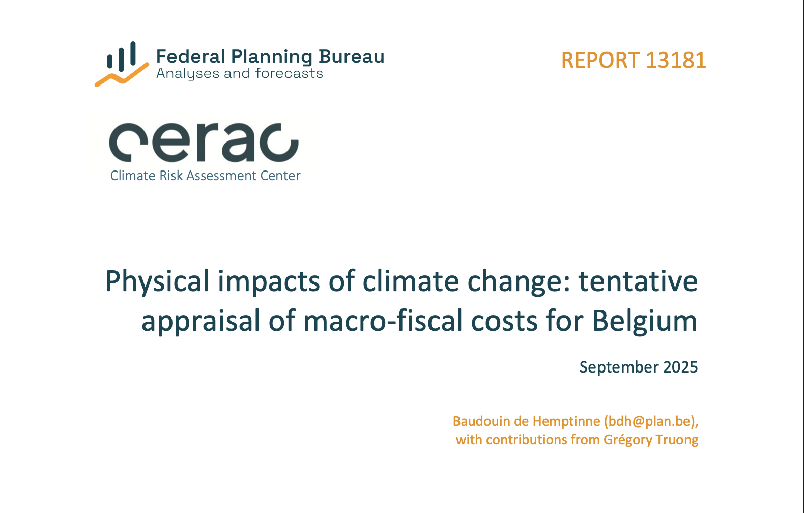 Dit rapport is een eerste resultaat van de onderzoeksovereenkomst tussen Cerac en het Federaal Planbureau. Cerac heeft dit rapport bij het FPB besteld en heeft de nodige klimaatgegevens en -informatie voorzien. Het vormt een eerste bijdrage aan de nieuwe vereiste in het EU-begrotingskader, die de lidstaten verplicht om, waar mogelijk, een middellange- en langetermijnbeoordeling te verstrekken van de macrobudgettaire impact van klimaatverandering, inclusief eventuele voorwaardelijke verplichtingen met mogelijke impact op de overheidsfinanciën.