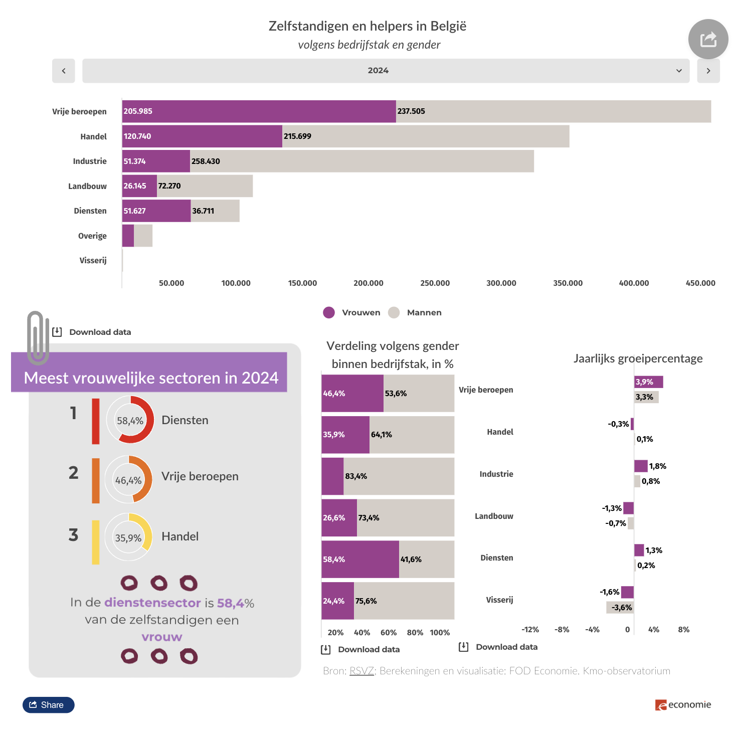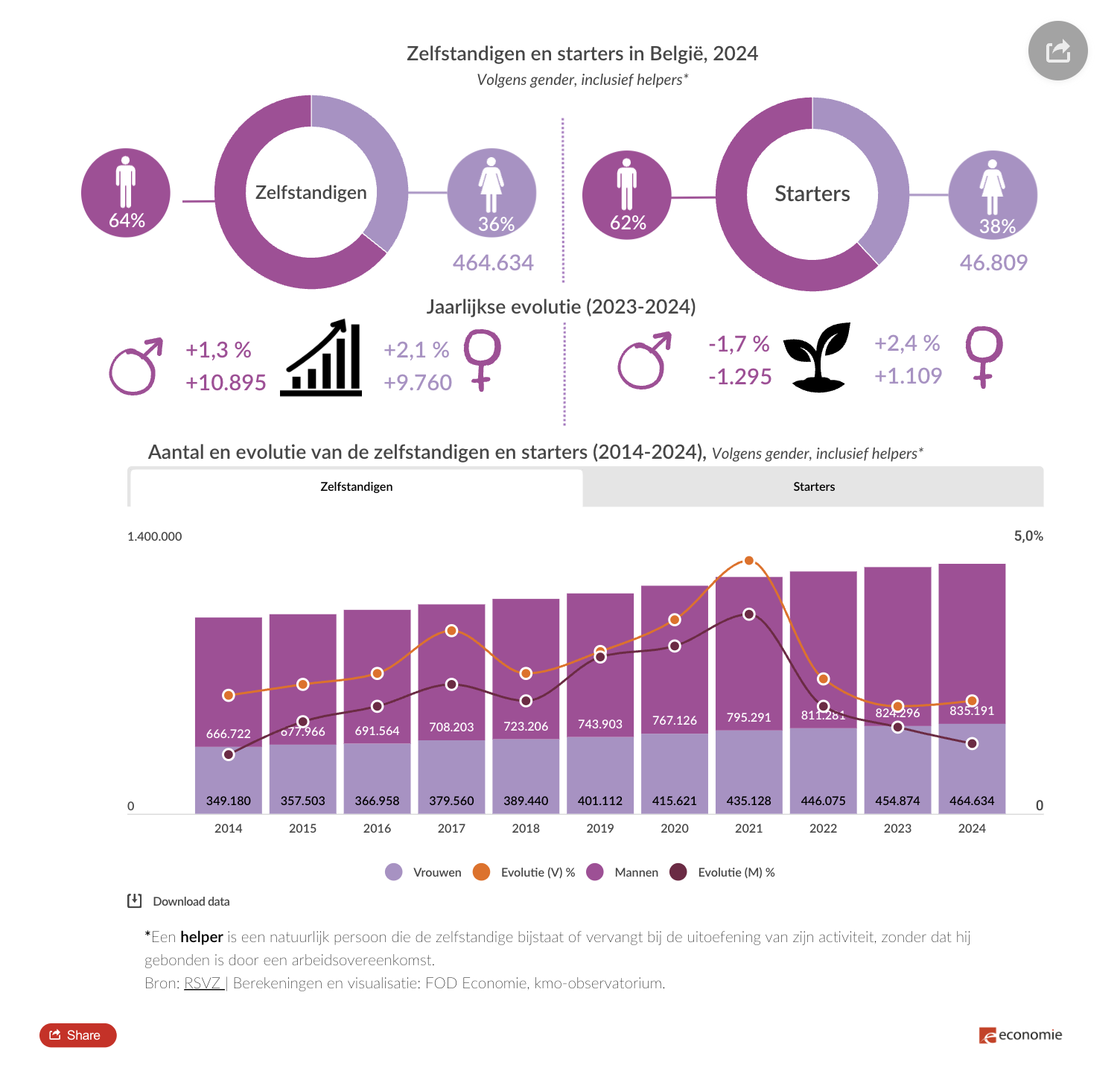 Vrouwen waren in 2024 goed voor 27,6 % van alle nieuwe zelfstandige activiteiten, dat zijn 46.809 vrouwelijke starters. Het gaat om een stijging van 2,4 % ten opzichte van 2023. Bij mannen werd daarentegen een daling van het aantal starters vastgesteld (-1,7 %).
