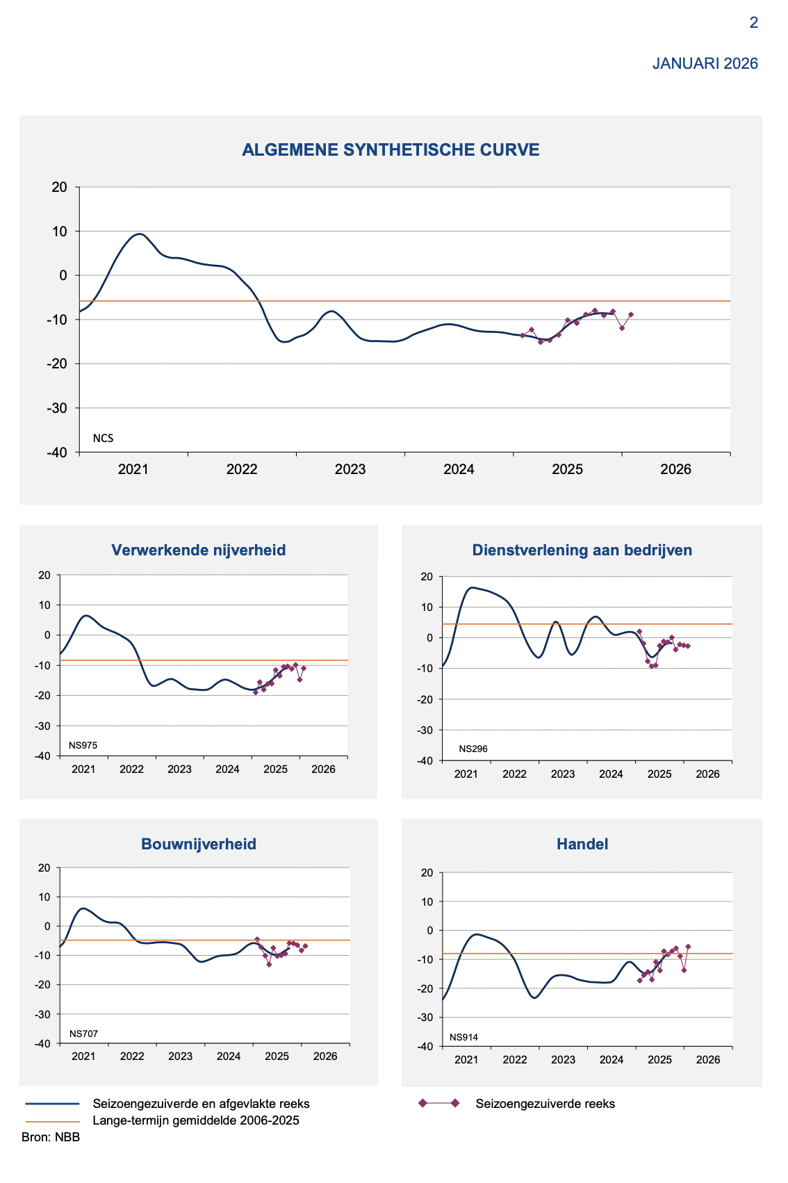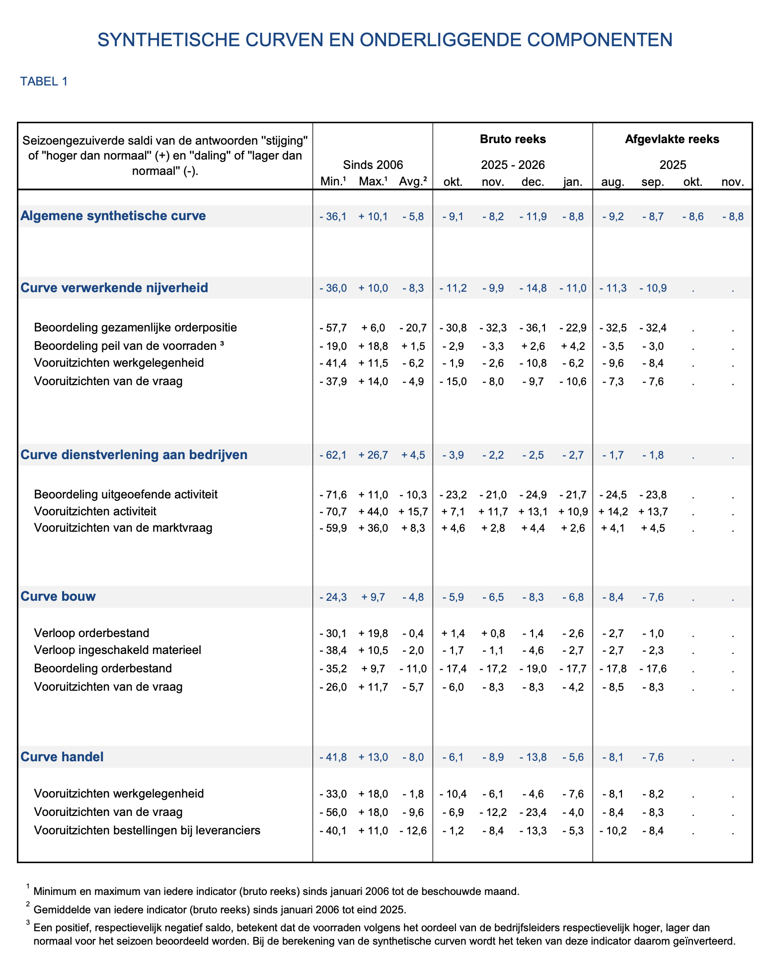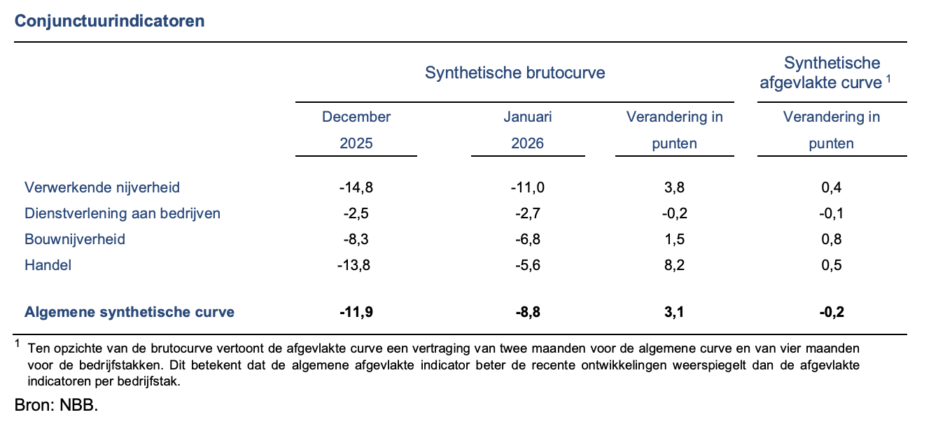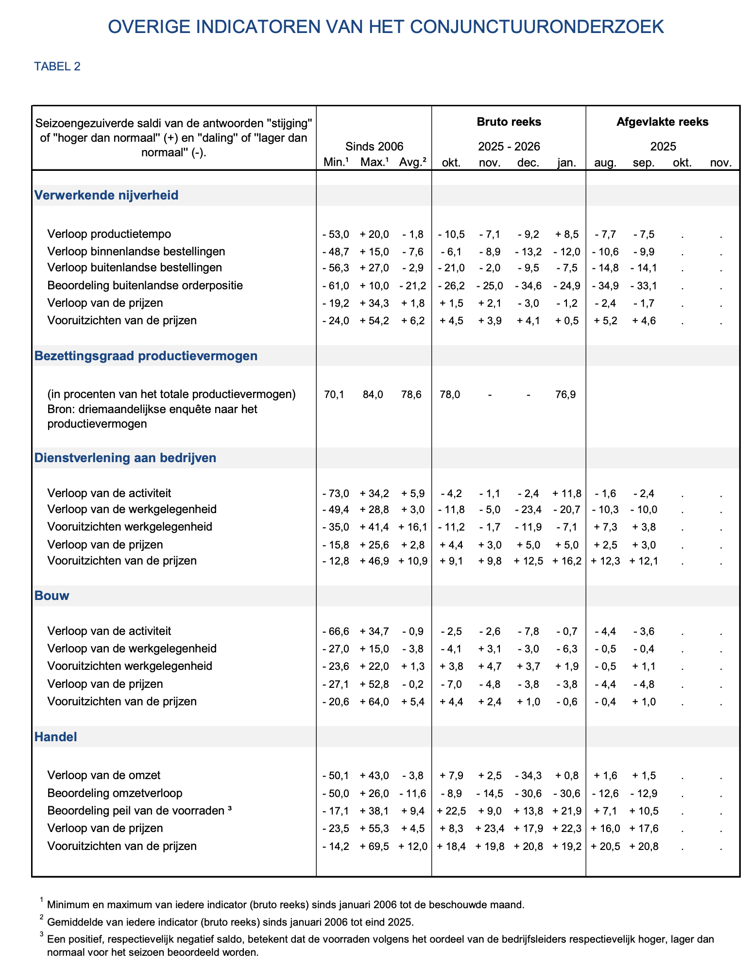 In de handel, waar de conjunctuurindicator het sterkst is gestegen, zijn de vraagvooruitzichten en de prognoses voor de bestellingen bij de leveranciers aanzienlijk verbeterd. De handelaars verwachten echter dat ze minder personeel zullen tewerkstellen in de komende drie maanden. In de verwerkende nijverheid is de vertrouwenswinst, na een sterke daling van de conjunctuurbarometer in december, toe te schrijven aan een aanzienlijk positievere beoordeling van de gezamenlijke orderpositie en, in beperktere mate, aan gunstigere werkgelegenheidsvooruitzichten. Het ondernemersvertrouwen in de bouwnijverheid veert terug op na opeenvolgende verslechteringen sinds oktober 2025. Dit is vooral te danken aan een sterke toename van de vraagvooruitzichten. Het conjunctuurklimaat in de dienstverlening aan bedrijven gaat dan weer achteruit voor de tweede maand op rij. Dit is het gevolg van een belangrijke neerwaartse herziening van de vooruitzichten voor zowel de algemene marktvraag als de eigen activiteit. Over het huidig activiteitsniveau zijn de bedrijfsleiders positiever. De algemene synthetische afgevlakte curve, die de onderliggende conjunctuurtendens weergeeft, is licht gedaald. Tot slot wijzen de resultaten van de driemaandelijkse enquête naar het productievermogen in de verwerkende nijverheid op een terugval van de bezettingsgraad ervan ten opzichte van het voorgaande kwartaal. De seizoengezuiverde bezettingsgraad daalde van 78,0 % in oktober tot 76,9 % in januari.