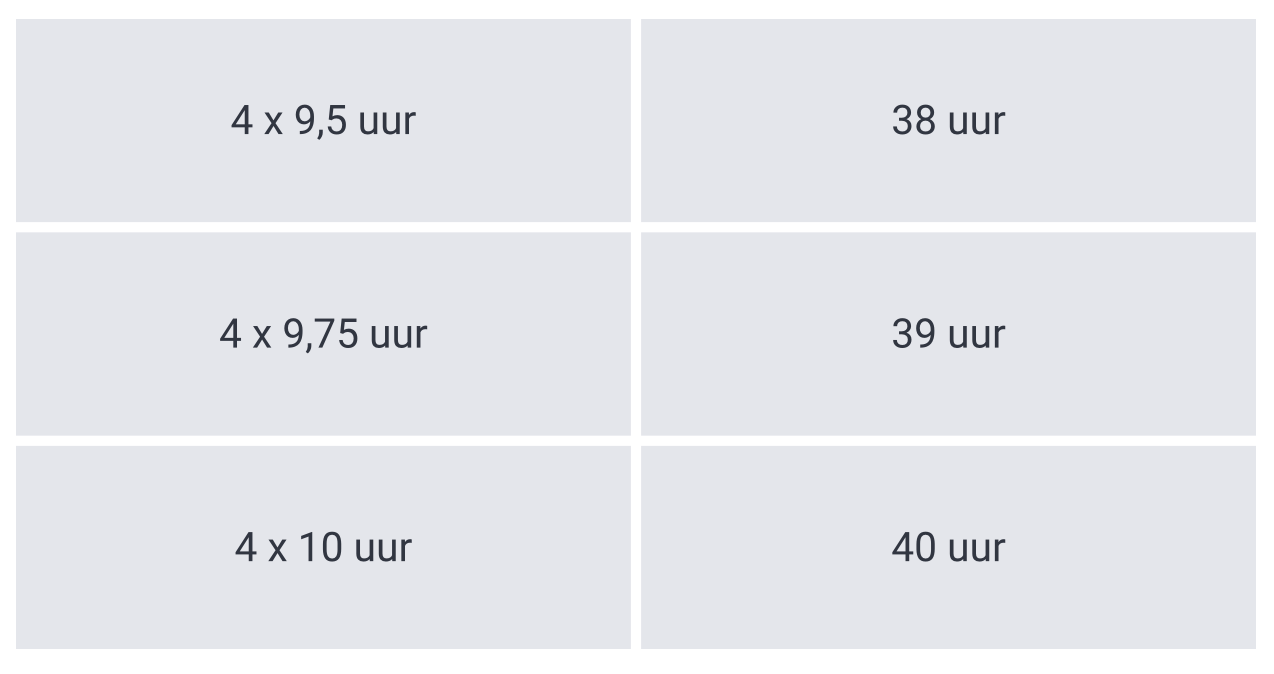 Ook dat kan. Met een vierdaagse werkweek presteren je werknemers hun voltijdse werkweek op vier dagen. Ze kunnen ook 39 of 40 uur presteren in vier dagen. Dat wordt dus: