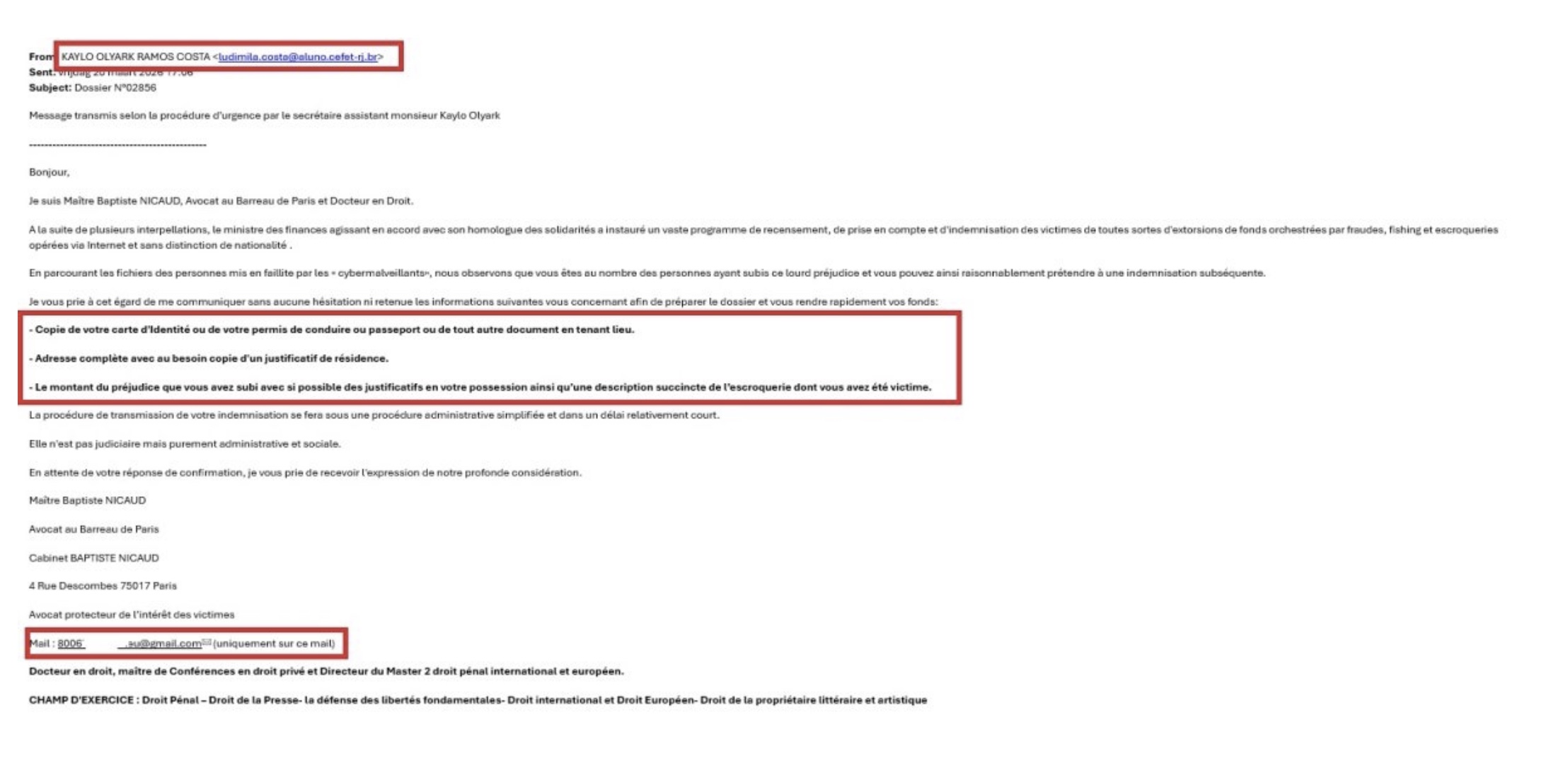 Dit bericht is verdacht omdat het afkomstig is van een ongepast e-mailadres, omdat het om persoonlijke documenten vraagt en omdat de afzender zich voordoet als een officiële of juridische instantie zonder geloofwaardige verificatie.