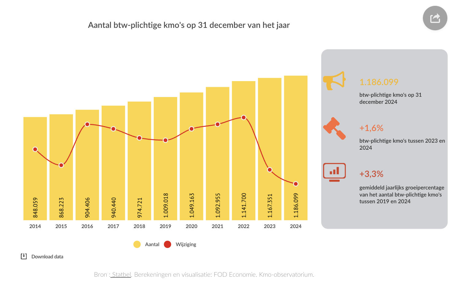 Het aantal kmo’s stijgt onafgebroken sinds 2014. Toch is er de voorbije twee jaar een afvlakking merkbaar. In 2023 kwamen er 25.651 ondernemingen bij, in 2024 zelfs maar 18.748. De drie jaren daarvoor (2019-2022) lag dit cijfer steeds boven de 40.000. Deze groei komt vooral doordat er elk jaar meer bedrijven worden opgericht dan stopgezet. De voorbije vijf jaar lag het jaarlijks aantal oprichtingen steeds boven de 100.000 terwijl er minder dan 90.000 kmo’s werden stopgezet.