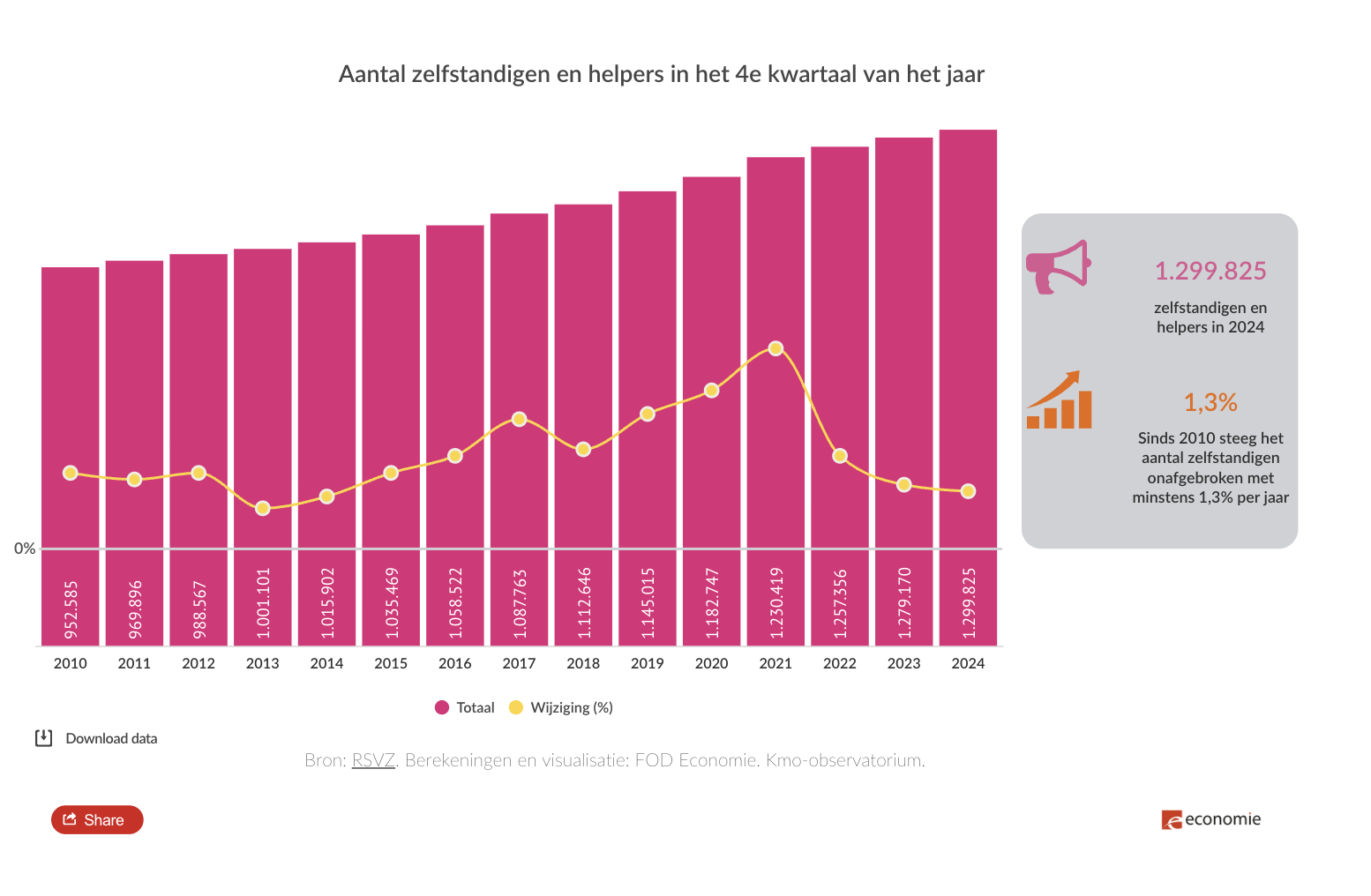 Het aantal zelfstandigen en helpers steeg ten opzichte van 2023 met 1,6 %. Dat levert een totaal van 1.299.825 ondernemingen op.