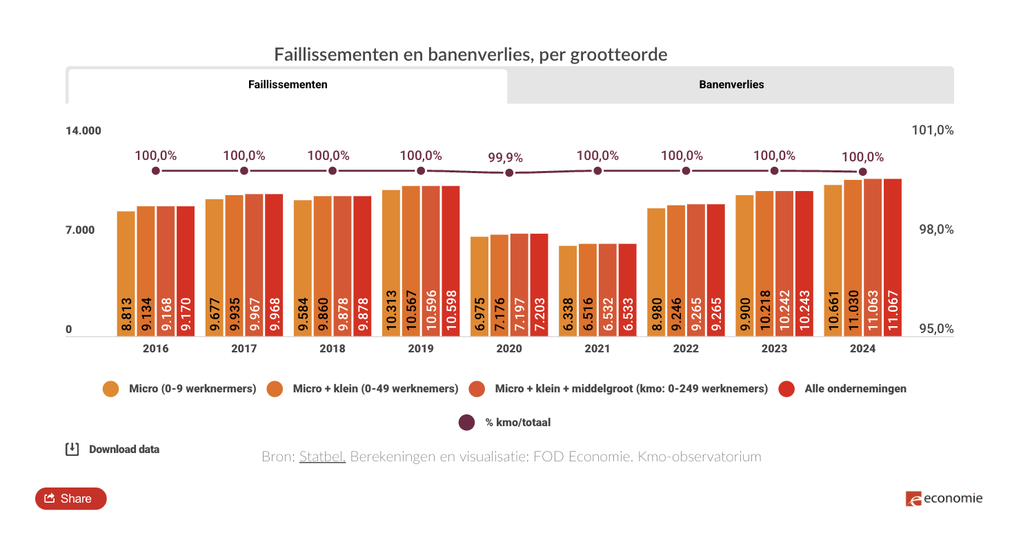 In 2024 gingen 11.063 kmo’s failliet. Dat is een stijging van 8 % in vergelijking met 2023. Door die faillissementen gingen er 25.784 banen verloren met een gemiddelde van 2,33 verloren banen per faillissement. Ook hier is een stijging van maar liefst 14 %.