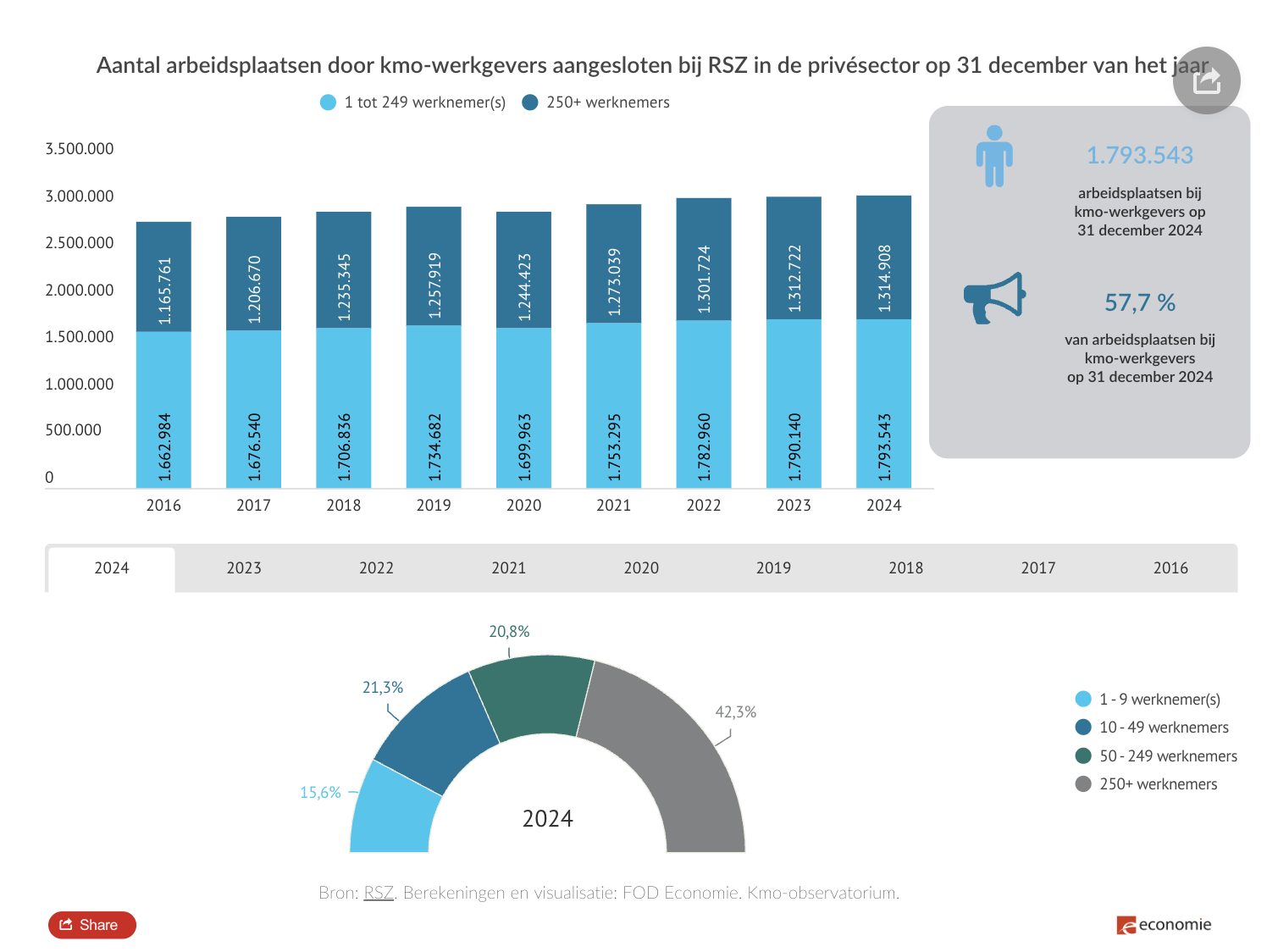Op 31 december 2024 waren er in België 1.793.543 jobs ingevuld in kmo’s. Dat is maar liefst 57,7 % van in totaal 3.108.451 jobs bij ondernemingen die ingeschreven zijn bij de Rijksdienst voor Sociale Zekerheid (RSZ). Extra opvallend: kmo’s vormen 99,3 % van alle werkgevers aangesloten bij de RSZ.