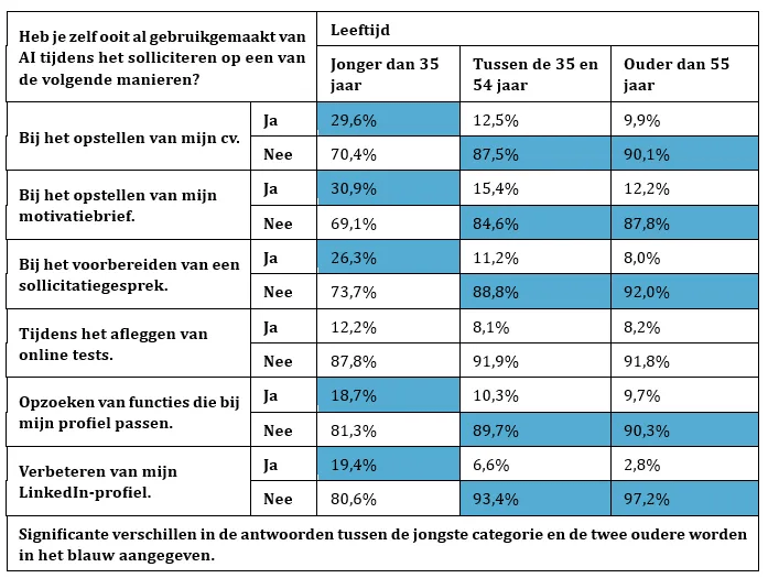 Significante verschillen in de antwoorden tussen de jongste categorie en de twee oudere worden in het blauw aangegeven.